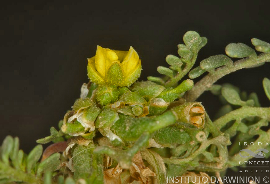 Hierbas perennes, glabras. Tallos de (0,5-)2-10(-15) cm de alto, postrados o rara vez erectos, solitarios o algunos pocos desde la base. Hojas basales pinnatisectas, de (1,5-)2,5-7(-10) cm de largo; pecíolos de 0,5-2(-4) cm de largo; lóbulos laterales 5-9 a cada lado, oblongos a ovados, enteros o lobulados, 1- dentados a cada lado o proximalmente, de 2-6(-11) × 0,5-2(-4) mm; hojas caulinares similares a las basales, más cortas, pecioladas, no auriculadas. Racimos 3-12-floros, corimbiformes, ebracteados o sólo las flores más basales bracteadas, alargados o no durante la fructificación; pedicelos fructíferos delgados, divaricados, de (0,5-)1,5-4(-6) mm de largo, glabros. Sépalos erectos, ovados, glabros o dorsalmente papilosos, persistentes hasta después de la madurez del fruto, margen membranáceo, no sacciformes, de 2-3 mm de largo, ligeramente más largos durante la fructificación; pétalos amarillos, obovados, de 2,5-4 × 1-2 mm; filamentos erectos, de 1,5-2 mm de largo; anteras ovoides, de 0,3-0,6 mm de largo; óvulos 50-80. Frutos ovoides a lanceolados, teretes, de 5-11 × 2-4 mm; septo completo; estilo de 0,5-2 mm de largo; estigma entero. Semillas 2-seriadas, ovoides, ligeramente aplanadas, castaño claro a amarillo pálido, coliculadas, de 0,7-1,1 × 0,5-0,7 mm.