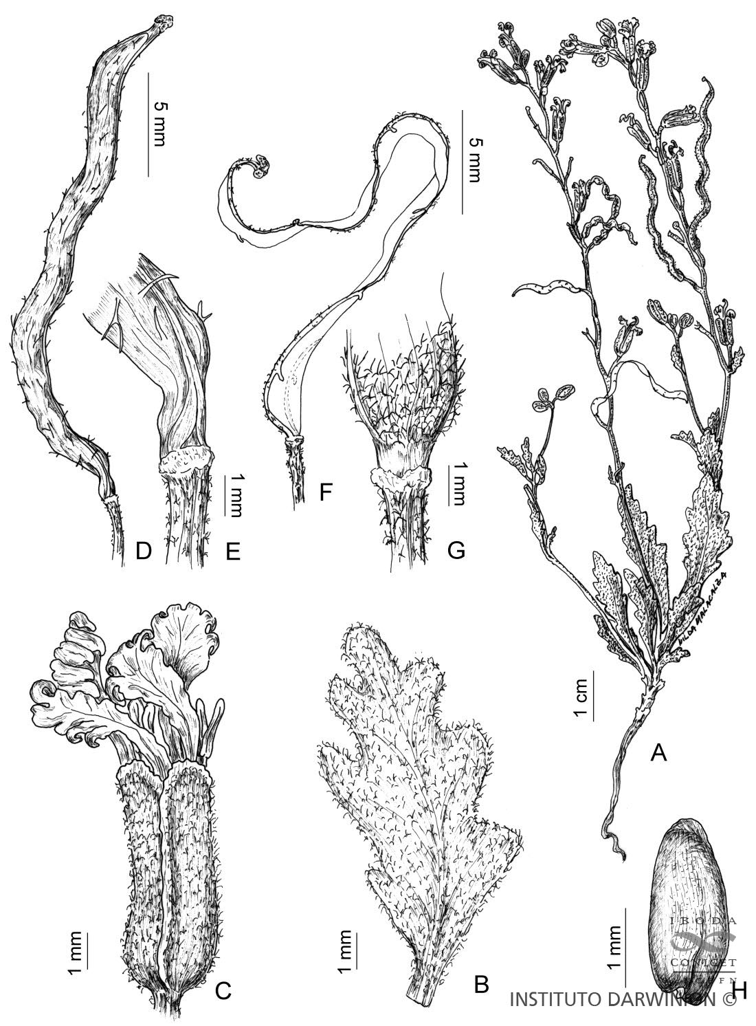 A. Planta. B. Hoja. C. Flor. D. Silicua. E. Silicua, porción basal. F. Replum con septo. G. Pedúnculo del septo. H. Semilla.