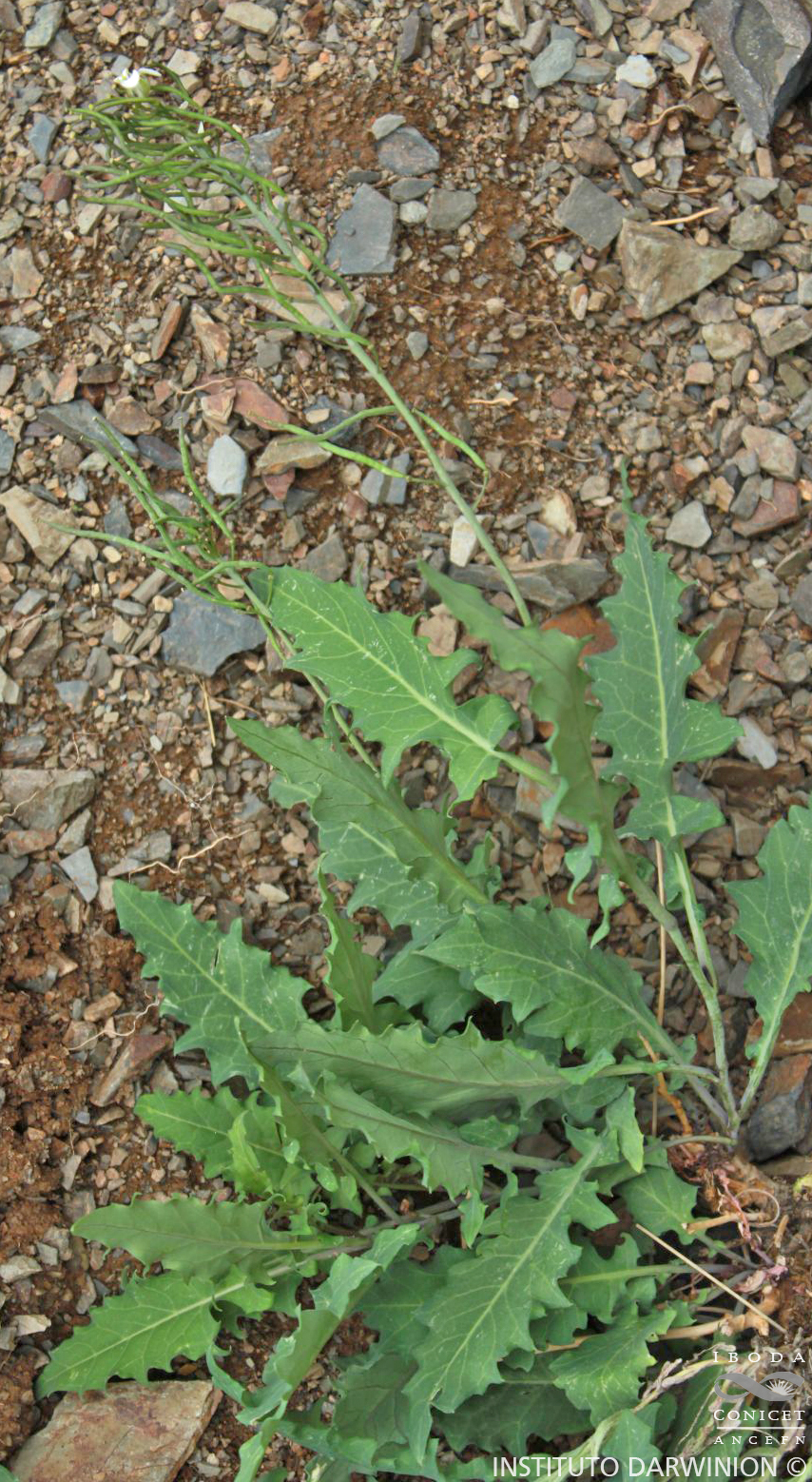 Hierbas perennes, glaucas, glabras. Tallos de (20-)40-90(-110) cm de alto, con base leñosa hasta de 1,5 cm de diámetro, erectos, glabros, 1 ó varios desde la base, ramificados en la parte superior. Hojas pecioladas, las basales y caulinares inferiores con pecíolos de (1-)2,5-9(-19) cm de largo; láminas ampliamente ovadas, subcordadas o lanceoladas, de (2-)3-8(-12) × (0,7-)1,5- 4,5(-7) cm, glabras, base cuneada a truncada, margen irregularmente denticulado o con 2-5 lóbulos a cada lado del nervio medio, lóbulos dentados; hojas caulinares superiores angostamente ovadas a lanceoladas, gradualmente reducidas en tamaño y amplitud hacia el ápice. Racimos ebracteados, 25- 80(-120)-floros, corimbosos, alargados considerablemente durante la fructificación; raquis recto; pedicelos fructíferos divaricados, ascendentes a suberectos, de 6-15 mm de largo, rectos o curvados hacia arriba, glabros. Sépalos oblongos, de 3- 5 mm de largo, glabros, no sacciformes; pétalos blancos, oblanceolados, de 4-7 × 1,7-3 mm, no unguiculados; filamentos blancos, pares medianos de 3,5-5 mm de largo; anteras oblongoides, de 1,3-1,8 mm de largo; óvulos 52-80. Frutos lineares, de 1,5-3,2(-4,5) cm × 1,2-2 mm, torulosos, sinuosos o rara vez rectos, usualmente subadpresos al raquis; valvas con un nervio central conspicuo, glabras; estilo de 0,5-1 mm de largo; estigma capitado, levemente 2-lobulado, considerablemente más ancho que el estilo. Semillas sub-2-seriadas, rara vez 1-seriadas, castañas, oblongoides, de 1,2-1,5 × 0,5-0,6 mm; cotiledones incumbentes.