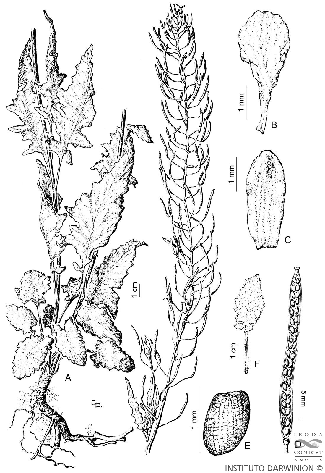 A. Planta. B. Pétalo. C. Sépalo. D. Silicua, corte longitudinal. E. Semilla. F. Hoja basal.