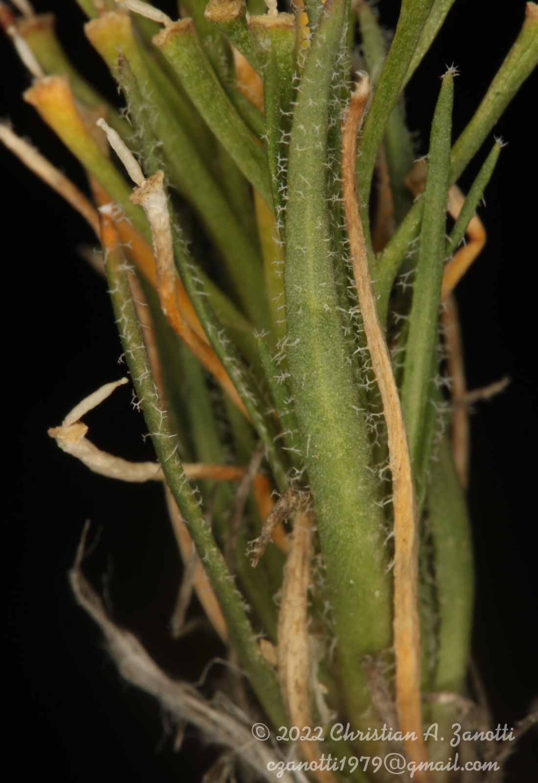 Plantas pubescentes; cáudice leñoso, hasta de 5 mm de diámetro. Tallos de 0,5-3 cm de largo, erectos, simples, glabros, no flexuosos distalmente. Hojas basales rosuladas, persistentes, coriáceas, filiformes a estrechamente lineares, más anchas en la base, de 1,5-5 cm × 0,2-1 mm, involutas, enteras, ciliadas, con tricomas setáceos y bifurcados, de (0,4-)0,6-1,3 mm de largo; hojas caulinares a menudo ausentes. Racimos 3-10-floros, ebracteados, no alargados durante la fructificación, más cortos o apenas excediendo las hojas basales; raquis de menos de 1 cm de largo, glabro; pedicelos fructíferos erectos, delgados, los más basales de 0,5-1,3 cm de largo, glabros. Sépalos oblongos, extendidos, de 2-3,5 mm de largo, escasamente pubescentes; pétalos blancos, de 3-4,2 × 1-1,3 mm, lámina obovada, uña notablemente diferenciada, de 1-1,3 mm de largo, ligeramente dilatada y diminutamente papilosa en la base; anteras oblongoides, de 0,7-1 mm de largo; filamentos de 2,5-3,5 mm de largo, papilosos en la base; óvulos 26-40. Frutos lineares, de 2- 3,5 cm × 0,8-1,2 mm, glabros, no torulosos; valvas 3-nervias, con nervios manifiestos; estilo de 0,5-1 mm de largo. Semillas oblongoides, de 1,5-2 × 0,6-0,8 mm, no aladas.