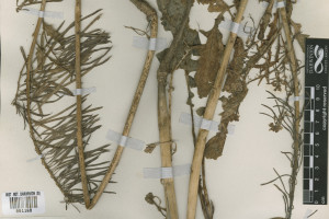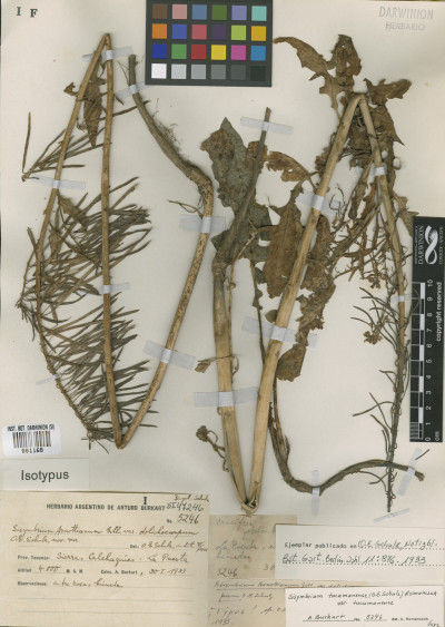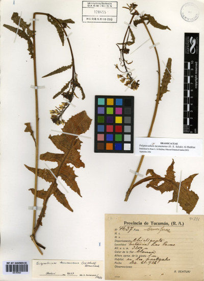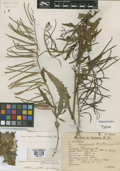 Hierbas perennes, escasamente hirsutas, con tricomas simples, de 0,5-2,5 mm de largo. Tallos de 0,3-1,5 m de alto, y de 5-15 mm de diámetro en la base, erectos, usualmente huecos, escasamente hirsutos o glabros, simples en la base, a menudo ramificados en la porción superior. Hojas caulinares inferiores con pecíolos de 1-5 cm de largo; láminas pinnatilobuladas, de 3,5-22 × 1,5-10 cm, escasamente hirsutas, lóbulos laterales 3-5 a cada lado del nervio medio, irregularmente dentados; hojas caulinares superiores pecioladas, angostamente lanceoladas a linear-lanceoladas, gradualmente reducidas en tamaño hacia el ápice de la planta, a menudo auriculadas. Racimos ebracteados, 20-82-floros, corimbosos, alargados considerablemente durante la fructificación; raquis recto; pedicelos fructíferos horizontales a descendentes y a veces dispuestos hacia un solo lado del eje, de 0,7-1,5(-2,2) cm de largo, rectos o curvados hacia arriba o abajo, glabros, rara vez con unos pocos tricomas. Sépalos oblongos, de 3,5-5 mm de largo, glabros, no sacciformes en la base; pétalos blancos o amarillo pálidos, obovados, de 5-8 × 2-4 mm; uña corta; anteras oblongoides, de 0,7-1 mm de largo; filamentos blancos, los pares medianos de 3,5-5 mm de largo; óvulos 70- 166. Frutos lineares, de 6-9 cm × 1,5-2 mm, no torulosos, no sinuosos, rectos o curvados, no adpresos al raquis; valvas con nervio central conspicuo, glabras; estilo de 0,5-1,5 mm de largo; estigma capitado, considerablemente más ancho que el estilo. Semillas 1-seriadas, castañas, ovoides, de 1,5-2 × 0,8-1 mm, irregularmente reticuladas, distalmente aladas; cotiledones incumbentes.