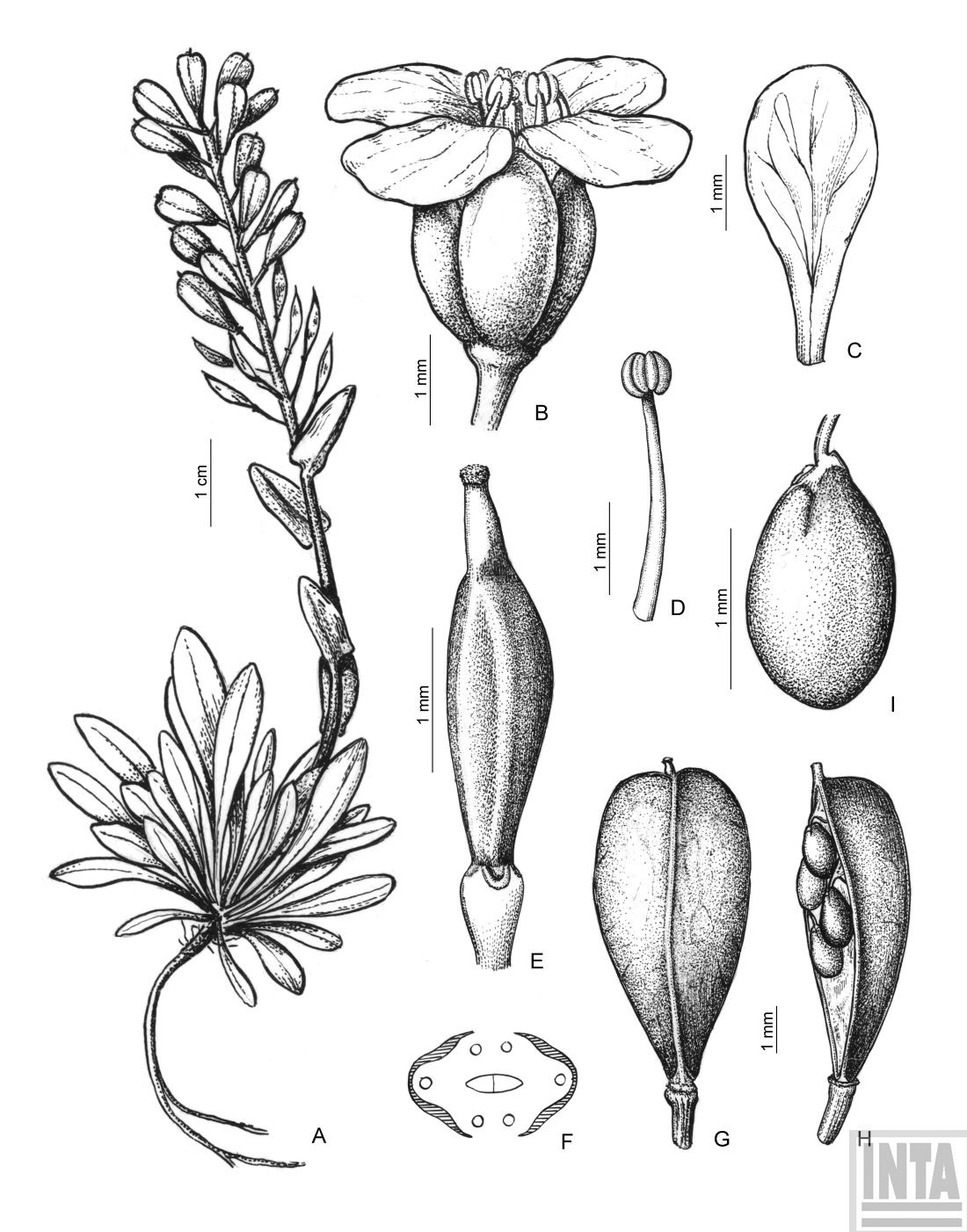 A. Planta. B. Flor. C. Pétalo. D. Estambre. E. Gineceo con nectarios. F. Esquema de nectarios. G. Silícula. H. Silícula abierta, mostrando las semillas. I. Semilla.