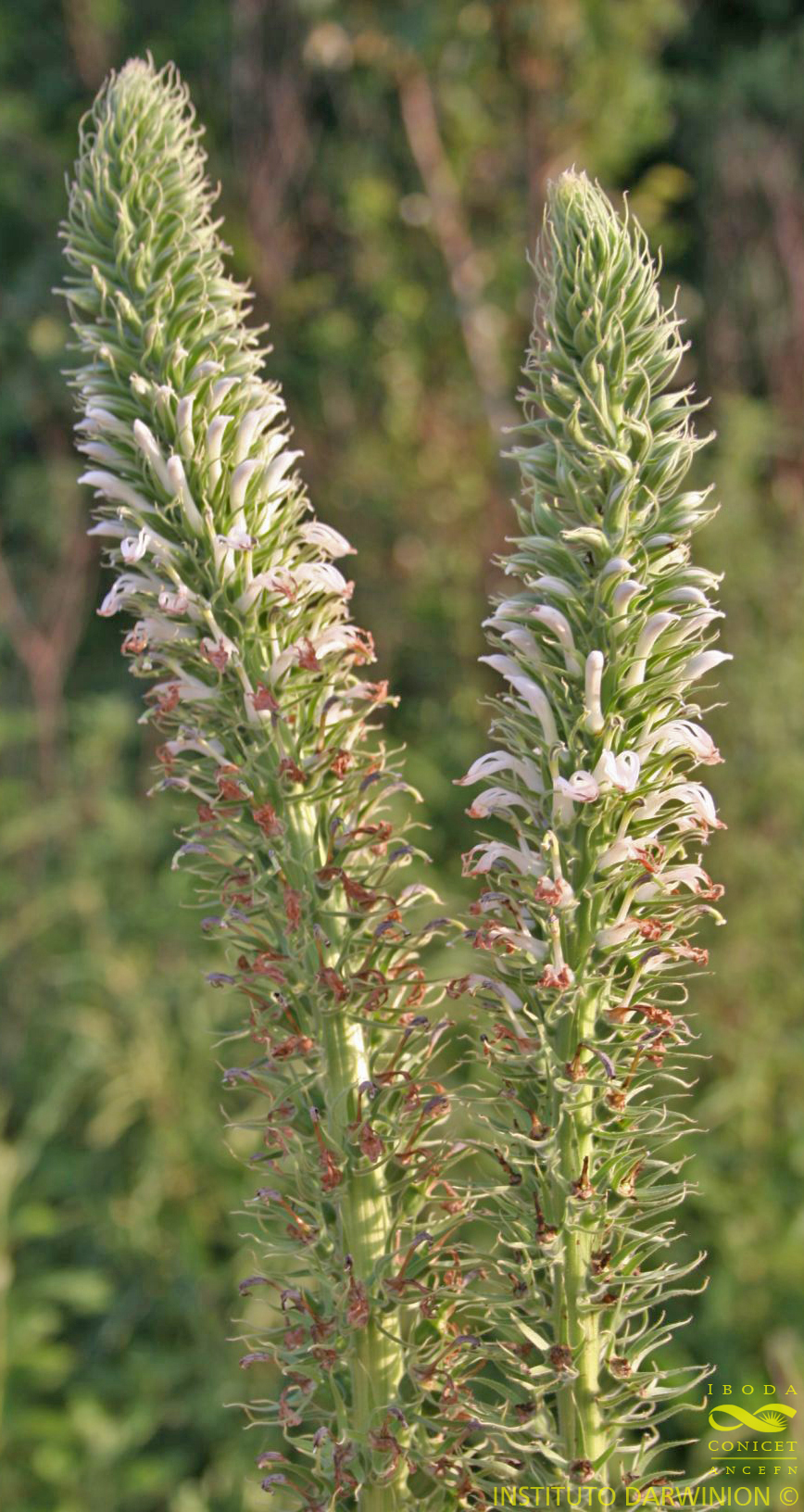 Hierbas robustas, de 1-3 m de alto, pubescentes. Hojas lanceoladas de 30-35 x 8-8,5 cm, sésiles, pubescentes, membranáceas, el ápice acuminado, la base decurrentes, márgenes enteros, denticulados. Racimos terminales densos, de 50-115 cm de largo, pubérulos, ocasionalmente con racimos inferiores floríferos; brácteas ovado-lanceoladas, de 28-30 x 5-6 mm, pubérulas, cuspidadas; pedicelos hasta de 10 mm de largo, bibracteolados hacia la porción media, pubérulos. Flores con hipanto de 3,5-4 mm de largo, pubescente; cáliz con lóbulos lineares, de 10-15 mm de largo; corola blanca, lilacina o verdosa a lilacina, de 20-24 mm de largo, pubérula; tubo estaminal piloso; filamentos ensanchados, pubescentes en el dorso; anteras inferiores barbadas hacia el ápice