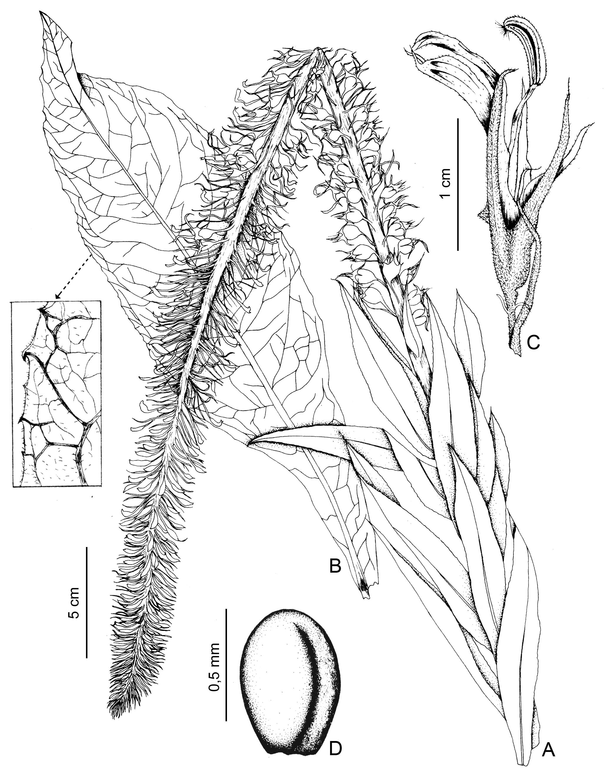 A. Rama florífera. B. Hoja basal con detalle del margen. C. Flor. D. Semilla. Tomado de Fl. Il Catarin. Fasc. CAMP: 59, fig. 15. 1989.