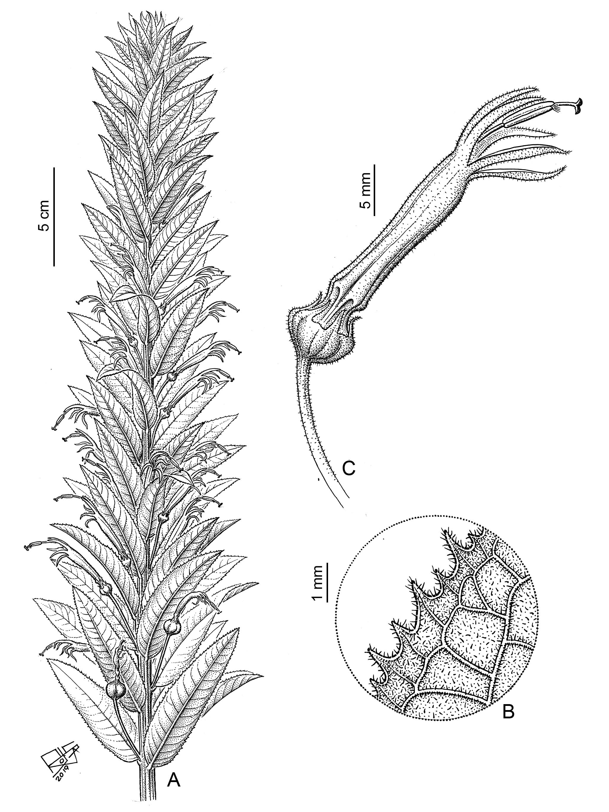 Rama florífera. B. Hoja, detalle del margen. C. Flor, vista lateral.