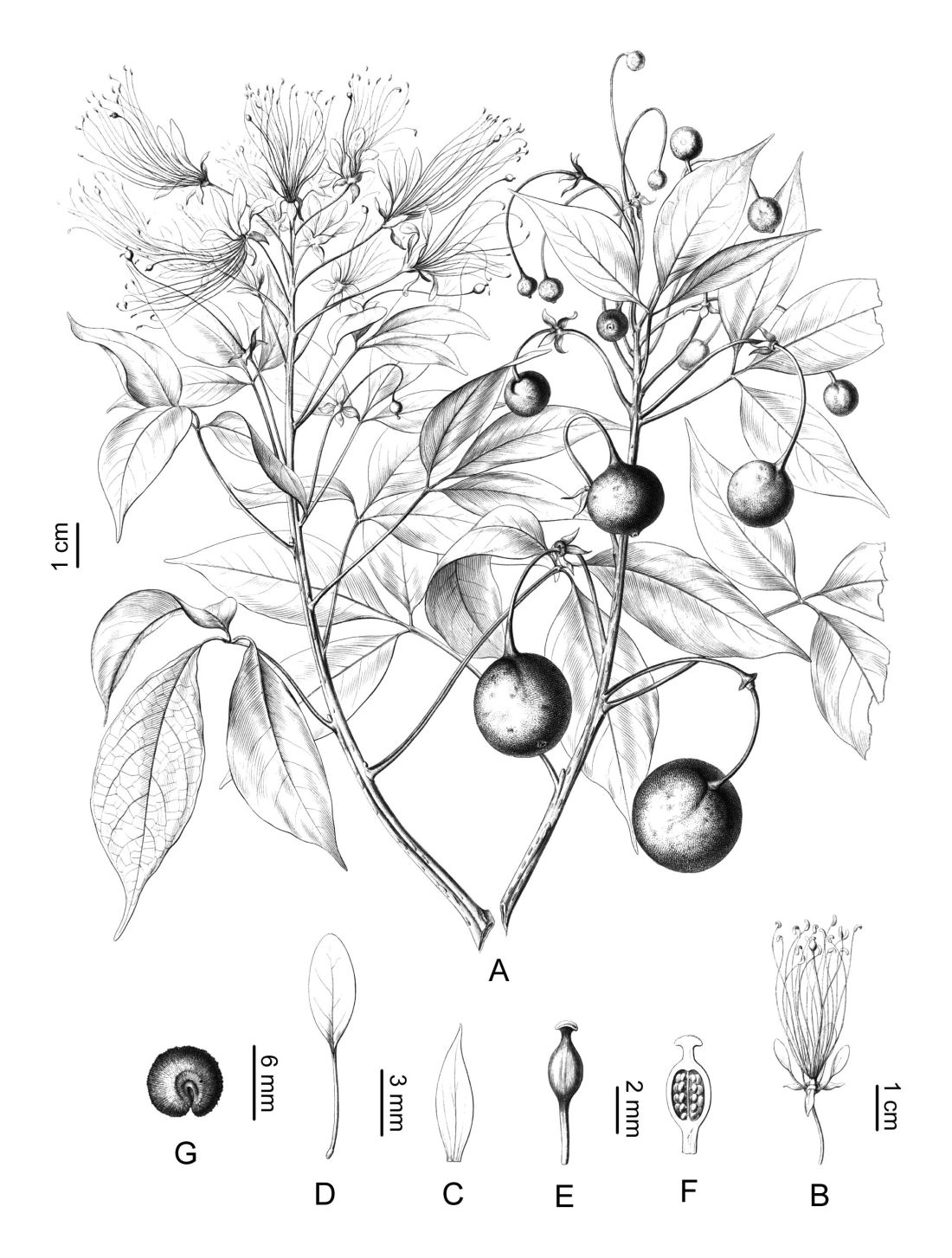 A. Rama florífera y fructífera. B. Flor. C. Sépalo. D. Pétalo. E. Gineceo. F. Gineceo, corte longitudinal. G. Semilla. Tomado de Fl. Bras. 13(1), tab. 59. 1865.
