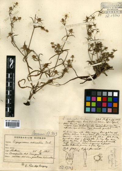 Hierbas perennes de 10-30 cm de alto; raíces fasciculadas. Ramas floríferas 1 a varias a partir de hojas basales, gráciles, estriadas, ascendentes a decumbentes, con ramificación dicasial y luego monocasial. Hojas basales pocas, ascendentes, subcoriáceas a cartáceas, más o menos efímeras, pecioladas, pecíolos de 5-10 cm de largo; láminas angostamente elípticas hasta lineares, decurrentes, de 5-7 × 0,5-1,5 cm, ápice agudo, margen espinuloso-serrado en la parte media y distal, entero o a veces dentado-espinoso hacia el pecíolo; venación paralela en el centro de la lámina, divergente y reticulada hacia los márgenes; profilos semejantes a las hojas basales, aunque progresivamente menores y sésiles. Capítulos blancos, ovoides a cilíndricos, de 5-10 × 3-8 mm; involucro evidente, brácteas involucrales patentes o ascendentes, lineares, de 5-25 mm de largo, coriáceas, punzantes; brácteas florales lineares a subuladas, más largas que los frutos. Flores blancas. Frutos ca. 1,5 mm de diámetro, mericarpios cubiertos por vesículas, cilíndricas a claviformes, angostas, subiguales.