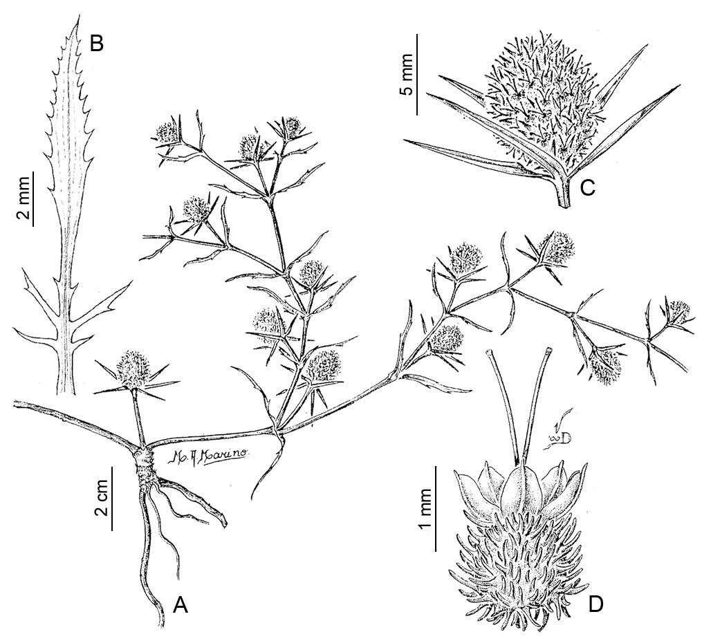 Hierbas perennes de 10-30 cm de alto; raíces fasciculadas. Ramas floríferas 1 a varias a partir de hojas basales, gráciles, estriadas, ascendentes a decumbentes, con ramificación dicasial y luego monocasial. Hojas basales pocas, ascendentes, subcoriáceas a cartáceas, más o menos efímeras, pecioladas, pecíolos de 5-10 cm de largo; láminas angostamente elípticas hasta lineares, decurrentes, de 5-7 × 0,5-1,5 cm, ápice agudo, margen espinuloso-serrado en la parte media y distal, entero o a veces dentado-espinoso hacia el pecíolo; venación paralela en el centro de la lámina, divergente y reticulada hacia los márgenes; profilos semejantes a las hojas basales, aunque progresivamente menores y sésiles. Capítulos blancos, ovoides a cilíndricos, de 5-10 × 3-8 mm; involucro evidente, brácteas involucrales patentes o ascendentes, lineares, de 5-25 mm de largo, coriáceas, punzantes; brácteas florales lineares a subuladas, más largas que los frutos. Flores blancas. Frutos ca. 1,5 mm de diámetro, mericarpios cubiertos por vesículas, cilíndricas a claviformes, angostas, subiguales.