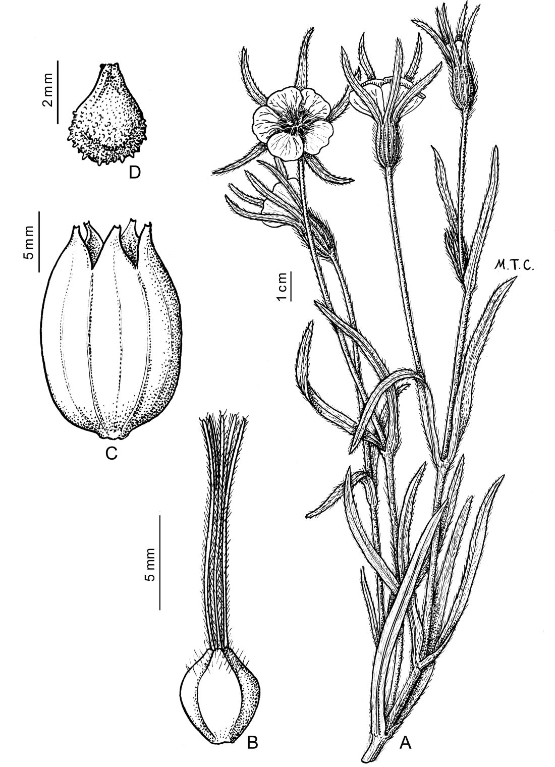 Hierba anual; tallos de 30-100 cm de alto, poco ramificados, dicotómicos, vilosos. Hojas de 5-10 × 0,3-1 cm, con tricomas largos y adpresos, agudas, excepto las inferiores que son subobtusas. Flores con tubo calicino de 1,5-3 × 0,7-1,5 cm, lacinias de 1,7-4,5 × 1-3(-4) cm; pétalos de 2,5-5 × 1-1,5 cm; pedúnculo floral de 7-20 cm de largo. Fruto de 15-18 × 10-12 mm. Semillas de 2,5-3,5 × 2-3 mm.