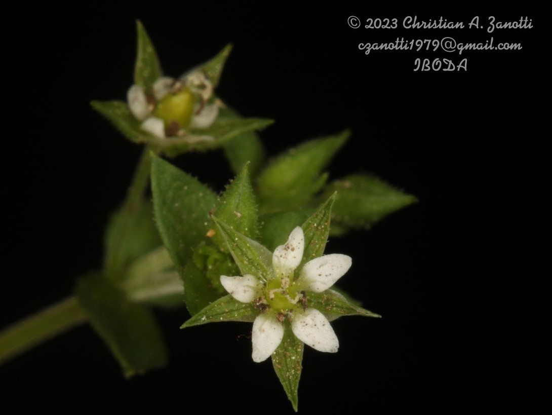 Hierba anual, erecta o ascendente, de (3-)5-30(-35) cm de alto; tallos cilíndricos, ramificados desde la base, pubescentes, con pelos simples y glandulares; entrenudos mayores que el largo de las hojas. Hojas ovadas o elípticas, de 1,5-4(-7) × (2-)4-6(-9) mm, ápice agudo, 3-5-nervadas, pubescencia de pelos simples y capitados, membranáceas; hojas inferiores pecioladas, las superiores sésiles. Flores solitarias, axilares; pedúnculos de 4-8 mm de largo; sépalos ovado a ovado-lanceolados, de 3-3,5(-4) × 1-2 mm, subiguales, los internos con margen escarioso amplio, pubescentes; pétalos 5, ovado-elípticos, de 1,5-3 mm de largo, ápice obtuso a redondeado, base atenuada; estambres 5, a veces 10, de la misma longitud que los pétalos, filamentos filiformes; anteras subglobosas, amarillas; ovario globoso, cortamente estipitado, con 25-30 óvulos; estilos 3, filiformes, de 1-1,5 mm de largo. Fruto una cápsula hinchada en la base, de (1,8-)2-3,5(-4) mm de largo, dehiscente por 6 dientes apicales, recurvos en la madurez. Semillas 18-30, reniformes, de 0,5-0,7 mm de diámetro, ornamentadas, verrucosas, opacas, gris oscuro.