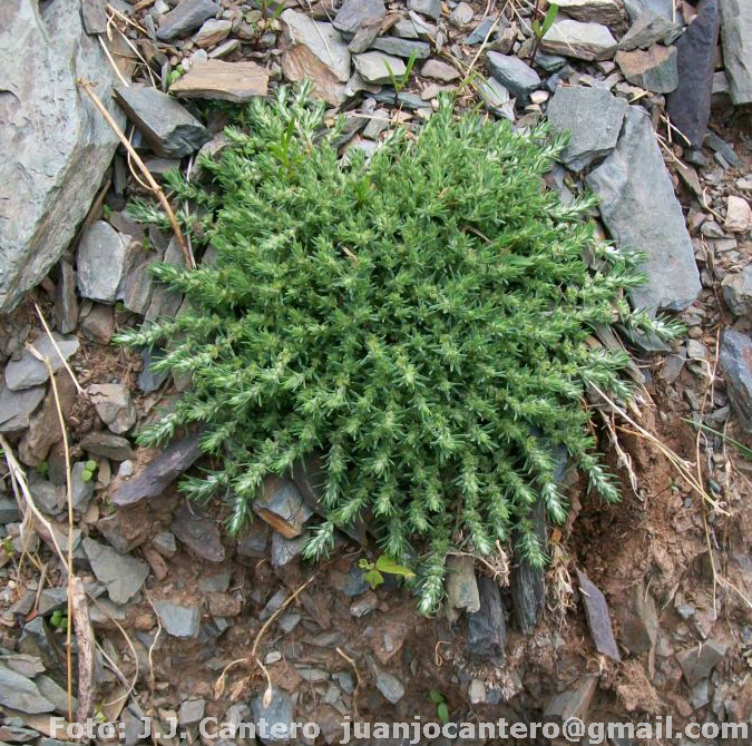 Hierba perenne, cespitosa, ramificada desde la base; tallos postrados, de 3-4 cm de largo. Hojas lineares, de 3,5-5 mm de largo, crasas, con el margen entero con el ápice terminando en un mucrón levemente escabroso; estípulas lanceoladas, ca. 2/3 el largo de las hojas, glabras, con el margen superior ± dentado, soldadas en los 2/3 basales. Inflorescencias formadas por cimas axilares y terminales de 1-4 flores; brácteas ovado-lanceoladas, de 2 mm de largo, cóncavas, fusionadas en la base, con el ápice acuminado y el margen laciniado. Flores subsésiles, cubiertas casi en su totalidad por las estípulas y brácteas; sépalos obovados, de 2-2,4 mm de largo, todos iguales, lanoso-ciliados, con el apéndice corniforme oblicuo, más cortos o de igual longitud que el sépalo, gruesos, y la espina apical de 0,5 mm de largo, lisa; pétalos ovados, de 0,1-0,2 mm de largo, más cortos que los filamentos estaminales, con el ápice 3-lobado y soldados en la base; estambres 3 ó 5; ovario sub-globoso. Fruto utrículo ovoide, de 1-1,3 mm de largo. Semillas piriformes, de 0,8-1 mm de largo, castañas, suavemente rugosas.