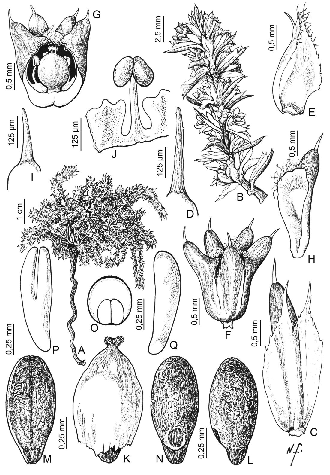 Hierba perenne, cespitosa, ramificada desde la base; tallos postrados, de 3-4 cm de largo. Hojas lineares, de 3,5-5 mm de largo, crasas, con el margen entero con el ápice terminando en un mucrón levemente escabroso; estípulas lanceoladas, ca. 2/3 el largo de las hojas, glabras, con el margen superior ± dentado, soldadas en los 2/3 basales. Inflorescencias formadas por cimas axilares y terminales de 1-4 flores; brácteas ovado-lanceoladas, de 2 mm de largo, cóncavas, fusionadas en la base, con el ápice acuminado y el margen laciniado. Flores subsésiles, cubiertas casi en su totalidad por las estípulas y brácteas; sépalos obovados, de 2-2,4 mm de largo, todos iguales, lanoso-ciliados, con el apéndice corniforme oblicuo, más cortos o de igual longitud que el sépalo, gruesos, y la espina apical de 0,5 mm de largo, lisa; pétalos ovados, de 0,1-0,2 mm de largo, más cortos que los filamentos estaminales, con el ápice 3-lobado y soldados en la base; estambres 3 ó 5; ovario sub-globoso. Fruto utrículo ovoide, de 1-1,3 mm de largo. Semillas piriformes, de 0,8-1 mm de largo, castañas, suavemente rugosas.