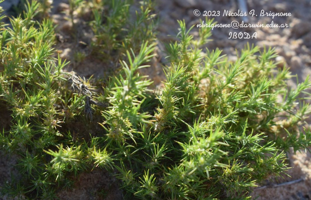 Hierba perenne; tallos decumbentes, muy ramificados, de 10-30 cm de largo, densamente hojosos, lanosos. Hojas subuladas, de 5-10 mm de largo, tiesas, con el margen entero y el ápice terminado en un mucrón punzante; estípulas triangulares, ca. 3 mm de largo, glabras, escariosas, el margen ciliado. Inflorescencias formadas por cimas axilares de 2-5 flores, densamente aglomeradas; brácteas ovado-orbiculares, ca. 2 mm de largo, hialinas, el ápice obtuso y margen lanoso. Flores sésiles; sépalos ca. 2-3 mm de largo, ciliados, el apéndice corniforme oblicuo, desiguales, siendo los 3 exteriores oblongo-ovados, con una espina apical lisa, 1-2 veces la longitud del sépalo, y los 2 interiores oblongos, con una espina muy reducida, apenas notable; pétalos escamiformes, redondeados, de 0,1 mm de largo, casi del mismo largo que los filamentos estaminales, con el ápice brevemente acuminado hasta sublobados y soldados en la base; estambres 5; ovario ovoide. Fruto utrículo de contorno oblongo, ca. 1 mm de largo. Semillas ovoides, de 0,8 mm de largo, castañas, lisas.