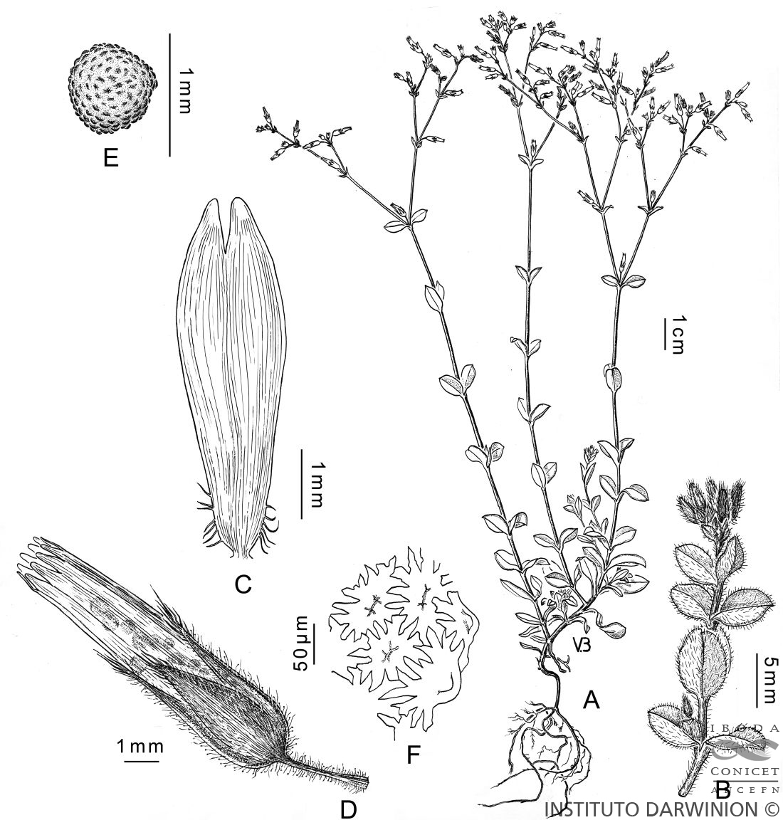 Hierbas anuales, de 5-40 cm de alto, muy ramificadas desde la base; tallos erectos o rastreros y ascendentes, hirsutos, a menudo con tricomas glandulares, todos floridos terminalmente. Hojas sésiles, de 6-30 × 3-15 mm, apiculadas, hirsuto-pubescentes, con nervio medio prominente; las inferiores obovado-espatuladas, atenuadas en la base; las superiores ovado-elípticas. Inflorescencias en cimas 3-50-floras, dicotómicas, con las flores congestas en los extremos de las ramas de la inflorescencia, de aspecto glomeruliforme por ser los pedicelos más cortos que el cáliz; pedicelos de 0,5-4 mm de largo, glandular-pubescentes; cáliz cilíndrico u ovado; sépalos lanceolados, de 3-6,5 mm de largo, papiráceos, con margen escarioso-hialino, con tricomas eglandulares largos, ascendentes, agudos, que a veces sobrepasan el ápice de los sépalos, mezclados con algunos tricomas glandulares; pétalos oblanceolados o elípticos, de longitud similar al cáliz o algo más cortos, 2-fidos en el tercio superior, lóbulos obtusos, seno agudo, a veces los pétalos están ausentes en las flores inferiores; estambres 10, algo más cortos que los pétalos; glándula nectarífera evidente; anteras globosas, amarillas; estilos 5, de 1-2 mm de largo, con superficie estigmática en la mitad distal. Fruto una cápsula cilíndrica, hasta de 8 mm de largo (ca. 2 veces el largo del cáliz), curvada, con 10 dientes erectos. Semillas ca. 1 mm de diámetro, castañas a castaño-rojizas, cortamente tuberculadas, con tubérculos redondeados.