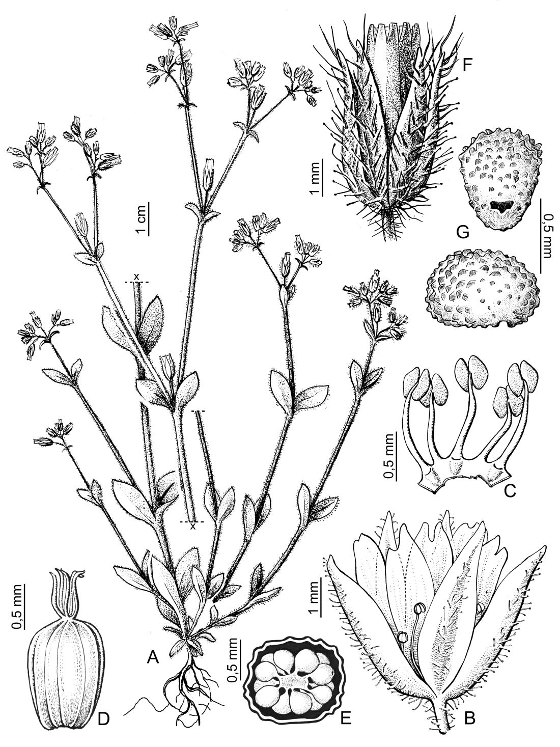 Hierbas anuales, de 5-40 cm de alto, muy ramificadas desde la base; tallos erectos o rastreros y ascendentes, hirsutos, a menudo con tricomas glandulares, todos floridos terminalmente. Hojas sésiles, de 6-30 × 3-15 mm, apiculadas, hirsuto-pubescentes, con nervio medio prominente; las inferiores obovado-espatuladas, atenuadas en la base; las superiores ovado-elípticas. Inflorescencias en cimas 3-50-floras, dicotómicas, con las flores congestas en los extremos de las ramas de la inflorescencia, de aspecto glomeruliforme por ser los pedicelos más cortos que el cáliz; pedicelos de 0,5-4 mm de largo, glandular-pubescentes; cáliz cilíndrico u ovado; sépalos lanceolados, de 3-6,5 mm de largo, papiráceos, con margen escarioso-hialino, con tricomas eglandulares largos, ascendentes, agudos, que a veces sobrepasan el ápice de los sépalos, mezclados con algunos tricomas glandulares; pétalos oblanceolados o elípticos, de longitud similar al cáliz o algo más cortos, 2-fidos en el tercio superior, lóbulos obtusos, seno agudo, a veces los pétalos están ausentes en las flores inferiores; estambres 10, algo más cortos que los pétalos; glándula nectarífera evidente; anteras globosas, amarillas; estilos 5, de 1-2 mm de largo, con superficie estigmática en la mitad distal. Fruto una cápsula cilíndrica, hasta de 8 mm de largo (ca. 2 veces el largo del cáliz), curvada, con 10 dientes erectos. Semillas ca. 1 mm de diámetro, castañas a castaño-rojizas, cortamente tuberculadas, con tubérculos redondeados.