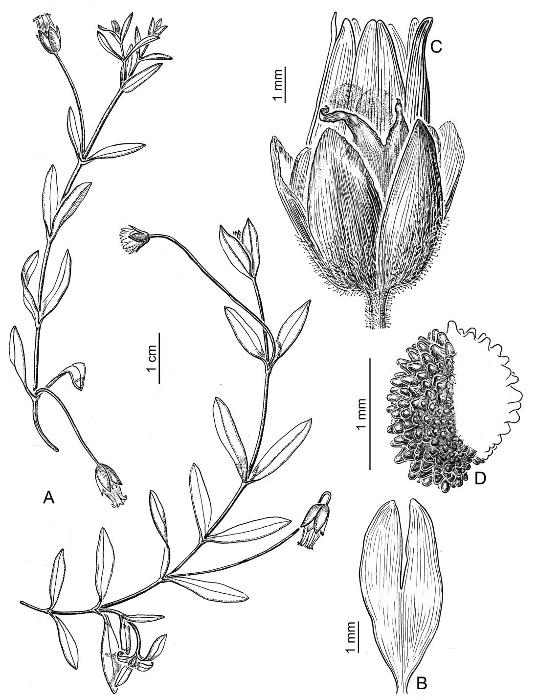 Hierbas anuales, rastreras o apoyantes, de 5-15 cm de alto; tallos gráciles, poco ramificados, radicantes en los nudos inferiores, pubérulos, con tricomas glandulares, entrenudos hasta ca. 4 cm de largo. Hojas sésiles, elípticas, lanceoladas, oval-lanceoladas u oblanceoladas, de 7-30 × 2-8 mm, de ápice redondeado a agudo, glabrescentes, nervio medio evidente. Flores solitarias, axilares y/o terminales; pedicelos de 20-65 mm de largo, acrescentes, glandular-hirsutos, más profusamente en la porción distal; sépalos ovados, de 3-5 × 1-3 mm, subagudos, papiráceos, hialino-escariosos en los márgenes; glandular-pubescentes hacia la base; pétalos elípticos a espatulado-elípticos, de 4-9 mm de largo, 2-fidos en la mitad superior, lóbulos obtusos, seno angosto; estambres 10, de longitud similar a la del cáliz; anteras orbicular-elipsoides; estilos 5, de 2-3 mm de largo. Fruto una cápsula ovoidea, 1,5-2 veces la longitud del cáliz, con 10 dientes revolutos. Semillas de 1,2-1,3 mm de diámetro, castaño oscuras, densamente tuberculadas, los tubérculos redondeados.