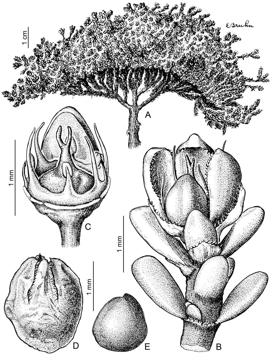 A. Planta. B. Detalle de rama florífera. C. Detalle de androceo y gineceo, más un sépalo interno. D. Fruto. E. Semilla.