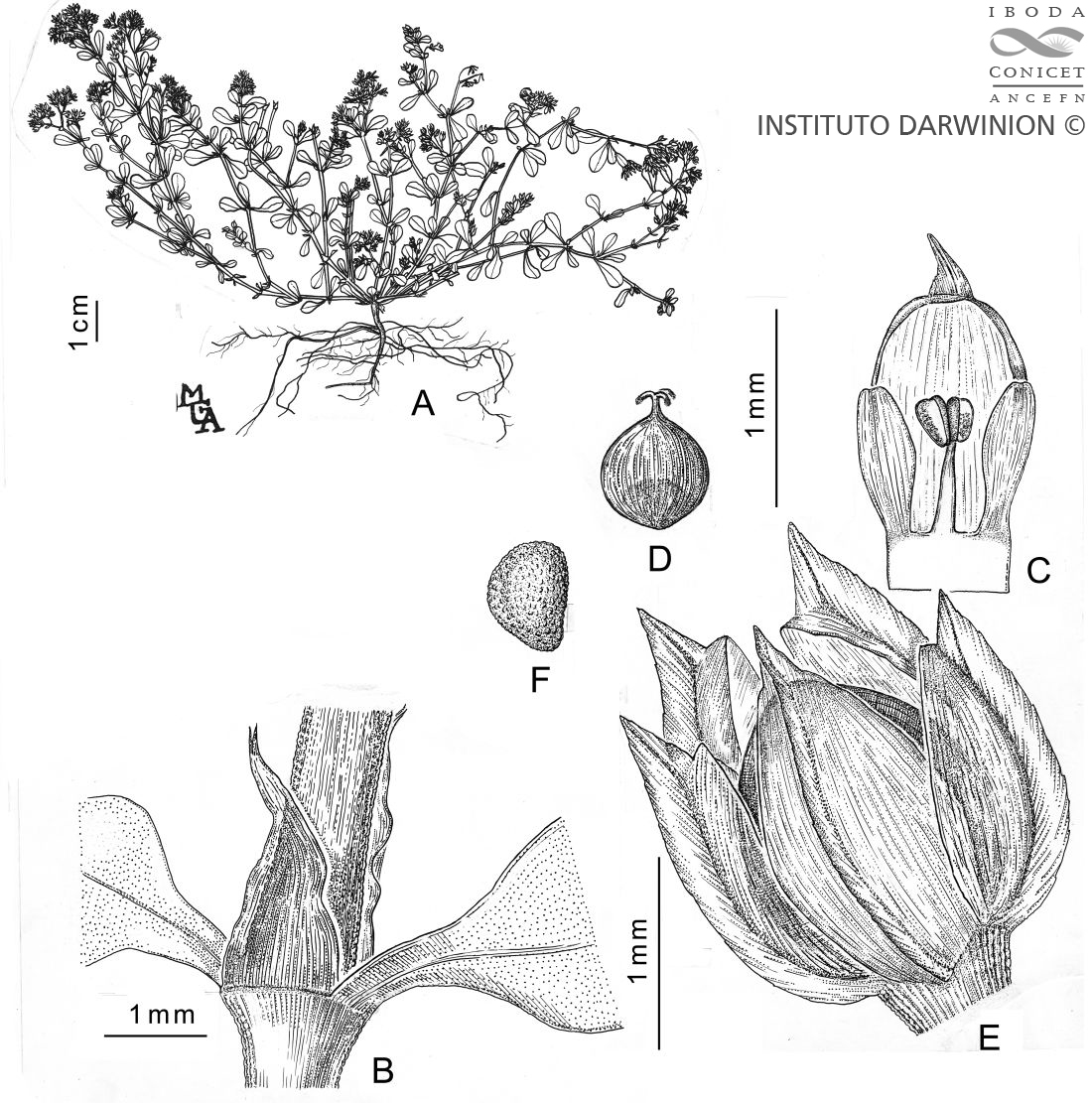 Hierbas generalmente anuales, a veces bienales y casi nunca perennes, glabras; tallo de (8-)10-25(-35) cm de alto. Hojas en verticilos de 5(-10), ocasionalmente las superiores opuestas, ovadas a lanceoladas, lineares o linear-lanceoladas, de (3-)5-15 × 3-8(-10) mm, de ápice obtuso, no carnosas, pecioladas; estípulas ovadas a lanceoladas, de ápice agudo o acuminado, hialinas. Inflorescencias en cimas dicotómicas con 5-10 flores, a veces 2-furcadas; sépalos ovados a lanceolados, de 1,5-2 mm de largo, de ápice agudo a acuminado, de márgenes anchos, hialinos, carenados, alados, con el ala verde y algo escabrosa; pétalos de 0,5-0,6 mm de largo, blanquecinos; estambres 3(-4), 1/3 más cortos que los sépalos; ovario 3-locular; estilo 3-fido hasta la mitad de su longitud. Fruto una cápsula más corta que el cáliz, de dehiscencia 3-valvar. Semillas piriformes, ca. 0,5 mm de largo, parduzcas, con tubérculos blanquecinos diminutos. Subsp. tetraphyllum.- Hojas ovadas a lanceoladas, en verticilos de 5.