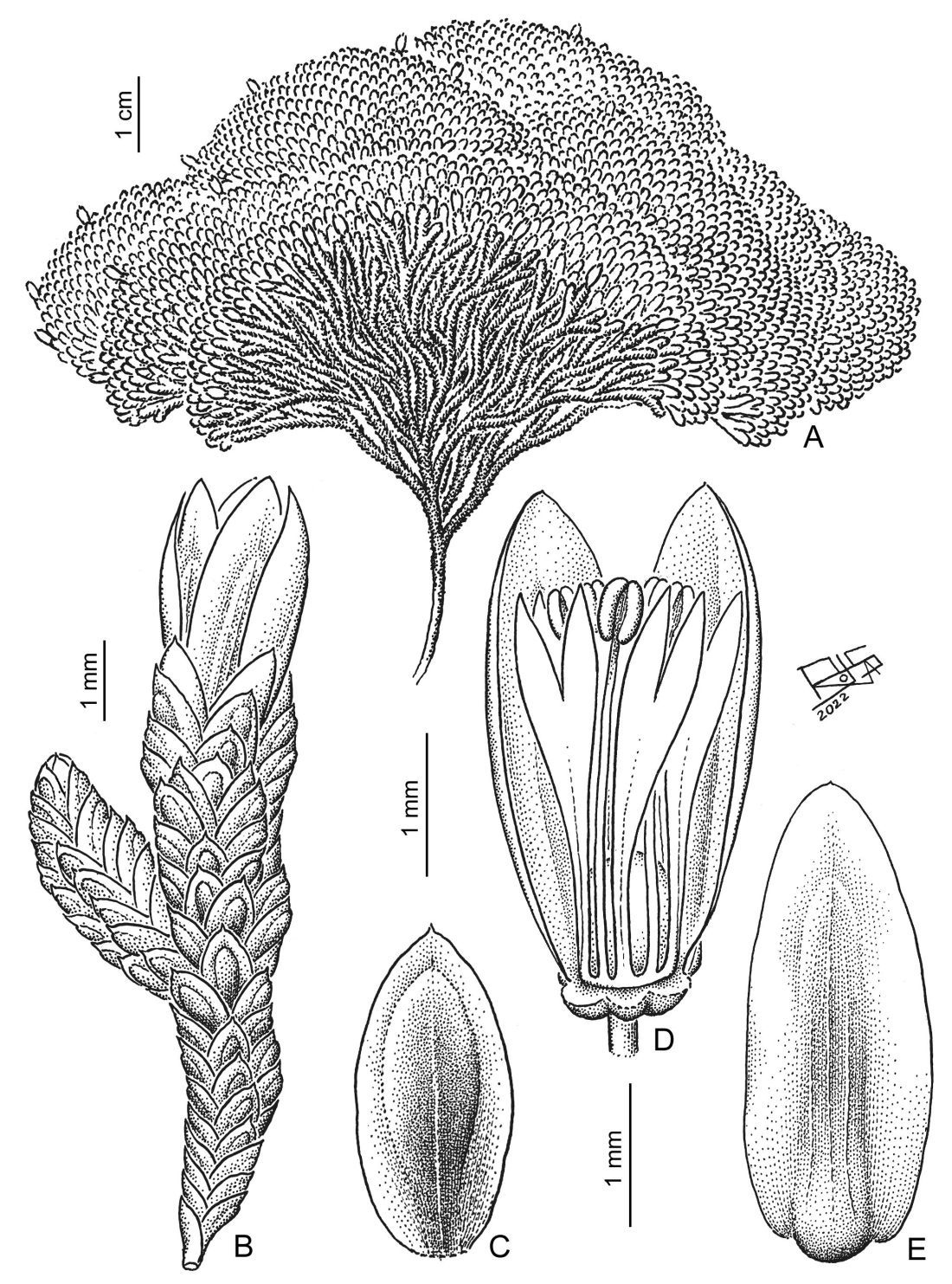 Arbustos hemisféricos, de 4-10 cm de alto y 15-25 cm de diámetro; tallo leñoso, ramas densamente agrupadas, a veces formando glomérulos, de color verdes oscuro a castaño oscuro, ferruginosas cuando secas. Hojas con la lámina oblonga a ovada, de (0,8-)1,1-2 × 0,5-1 mm, recta, ligeramente canaliculada, de ápice agudo a mucronulado, escariosa, margen membranáceo levemente desarrollado; callo medio ausente o desarrollado, ovado, castaño a castaño-amarillento; vaina de 0,5-0,7 mm de largo, oscuro-estramínea, translúcida. Flores con pedicelo hasta de 0,2 mm de largo y con 4 brácteas oblongas, de 2-2,2 × 0,6-0,8 mm, de ápice obtuso. Flor estaminada con los sépalos ovados a oblongos, cimbiformes, de 2,5-3,5 × 0,8-1,5 mm, rectos, de ápice agudo, con el margen ligeramente involuto, escariosos, amarillo-pálidos a estramíneos, superficie abaxial con un callo levemente desarrollado cubriendo la región central del sépalo, de color castaño pálido; pétalos 5, obovados, de 0,8-3 × 0,3-0,8 mm, de ápice 2-fido hasta 1/3 de su longitud, cremosos; estambres (4-)5, de 2-3,5 mm de largo, los filamentos filiformes; pistilodio elipsoide a ovoide, de 1-1,8 × 0,6-0,8 mm; disco plano. Flor pistilada con sépalos ovados a oblongos, cimbiformes, de 2,5-3 × 1-1,5 mm, rectos, de ápice agudo a obtuso, con el margen ligeramente involuto, escariosos, amarillo-pálidos a estramíneos, superficie abaxial con un callo levemente desarrollado cubriendo la región central del sépalo, de color castaño-pálido; pétalos 5, oblanceolados, de 1-1,5 × 0,3 mm, de ápice 2-fido, hasta de 1/4-1/3 de su longitud total, cremosos, translúcidos; estaminodios 5, ca. 0,5 mm de largo, filamentos filiformes; disco plano; ovario ovoide, de 1-2,3 × 0,8-1 mm, estigma 3-fido, papiloso. Utrículos ovoides 3-gonos, de 1,5-1,8 × 1,2-1,4 mm. Semilla 1, reniforme, comprimida lateralmente, de 1 × 0,8-1 mm, castaña, con la superficie levemente papilosa.