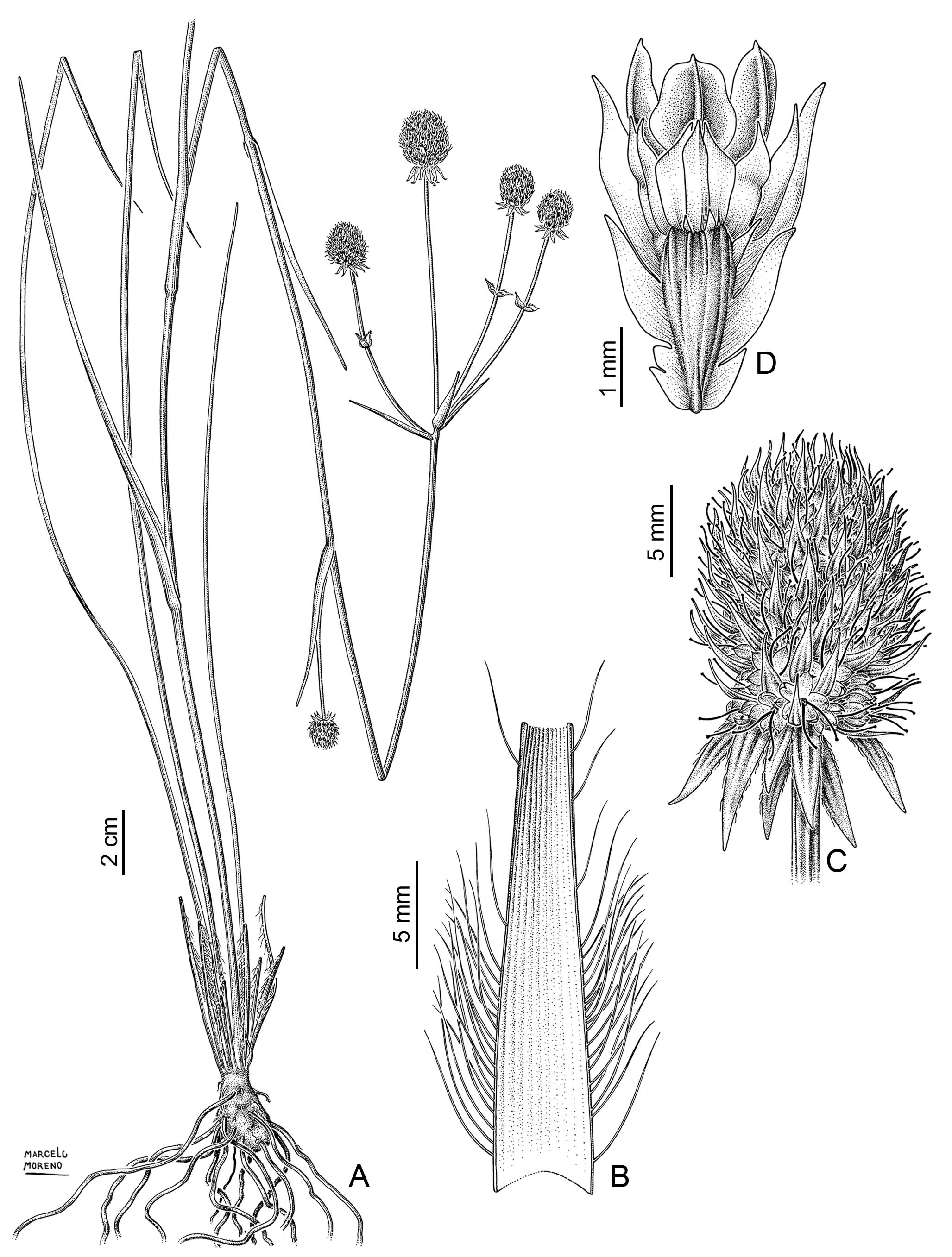 Hierbas perennes, junciformes, de 0,3-1 m de alto; raíces fasciculadas, largamente fibrosas sobre un rizoma corto, subtuberoso. Tallo primario erecto, grácil, simple o poco ramificado distalmente, con 1-4 capítulos. Hojas basales ascendentes, coriáceas, sésiles; láminas lineares, de 15-50 × 0,2-0,5 cm, ápice agudo a obtuso, margen velloso en la base, por lo demás inerme, vaina muy dilatada, densamente vellosofimbriada; venación paralela; hojas caulinares pocas, semejantes a las basales pero menores, amplexicaules, generalmente setoso-fimbriadas en la base. Capítulos celestes, ovoides a globosos, de 10-18 × 10-15 mm; involucro generalmente conspicuo, brácteas patentes o reflejas, subuladas, agudas, de 7-12 mm de largo; brácteas florales semejantes, hasta de 7 mm de largo, superando los frutos. Flores celestes. Fruto de 3 × 2 mm, mericarpios con escamas laterales y calicinales planas, aliformes, dorso desnudo.