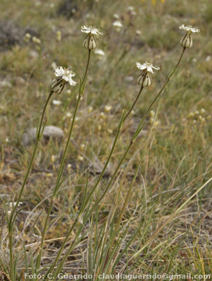 Hierba perenne, con el cáudice leñoso, ramificado, formando pequeños cojines; tallos erguidos, simples, de 5-20 cm de largo, ± densamente cubiertos por tricomas simples y glandulares. Hojas basales lineares, de 0,5-5 × 0,5-0,15 cm, muy angostas, acanaladas, pubescentes en la base y en la cara adaxial; ápice agudo, casi mucronado; hojas superiores similares a las basales o algo menores, con pubescencia más densa. Flores erguidas, generalmente solitarias, con pedúnculo de 12-50 mm de largo; cáliz campanulado, de 8-11 mm de largo, glanduloso-pubescente, 10-nervado, con 5 dientes triangulares con margen hialino amplio; pétalos triangular-invertidos, de 15-17 mm de largo, con uña ca. 2/3 del largo total, pubescente en la base, limbo 2-lobado, con 2 aurículas basales y 2 escamas coronales ± triangulares, blancos o blanquecinos; estambres ca. 13 mm de largo; ovario fusiforme, de 4-7 mm de largo, con 3-5 estilos; carpóforo breve. Cápsula ovoide, encerrada en el cáliz, dehiscente por dientes en número doble al de estilos. Semillas reniformes, ca. 1,2 mm de diámetro, comprimidas e indistintamente aladas, con eminencias lineares transversales ordenadas en semicírculos concéntricos en las caras.
