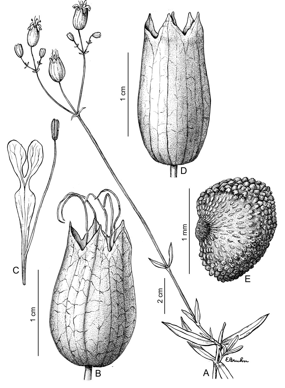 Hierbas perennes, glabras, raramente pubescentes, densamente hojosas, ginodioicas; tallos robustos, erectos, decumbentes en la base, generalmente ramificados, de 20-80 cm de alto. Hojas 2 por nudo, lanceolado-oblongas o linear-lanceoladas, de 2-8 × 0,5-3 cm, sésiles, agudas a acuminadas, glabras. Inflorescencias en cimas dicotómicas laxas, 3-5 veces ramificadas, con el primer par de brácteas lanceoladas y foliosas, las superiores escariosas. Flores perfectas e imperfectas, con pedicelos hasta de 3 cm de largo; cáliz campanulado, de 11-17 mm de largo, inflado, sobre todo en el fruto, 20-nervado, glabro, con los dientes ampliamente triangulares; pétalos blancos, de 15 mm de largo, uña ca. 10 mm de largo, el limbo profundamente 2-lobado, sin aurículas, con 2 escamas coronales pequeñas o no; estambres exertos ca. 2-4 mm de largo; estilos 3, también exertos; carpóforo hasta de 3 mm de largo, glabro. Cápsula ovoidea a globosa, encerrada en el cáliz, dehiscente por 6 dientes. Semillas reniformes, de 1-1,5 mm de diámetro, grisáceo-negruzcas, con papilas ordenadas en 6 hileras dorsales y 2-4 semicírculos concéntricos en ambas caras.