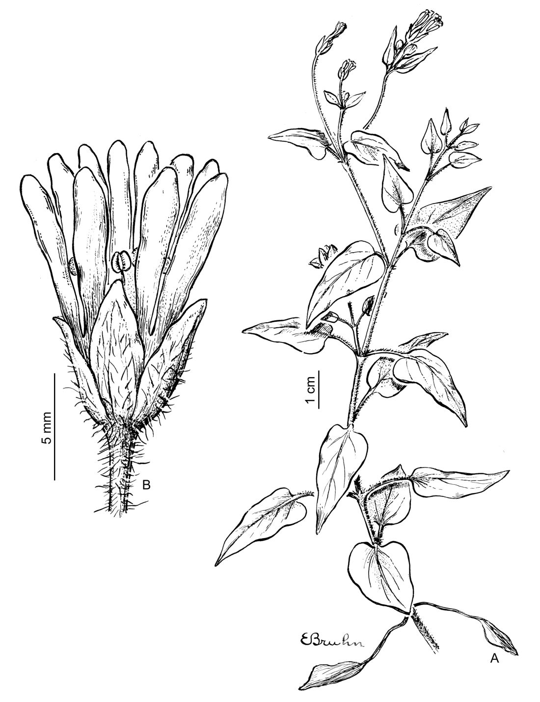 Hierba anual, hasta de 50 cm de alto, con tricomas de 1,5 mm de largo, simples y capitados. Hojas triangulares a oval-triangulares u oval-lanceoladas, de 0,7-3,5 × (0,3-)0,4-1,5(-1,7) cm, base cordiforme a truncada, a veces atenuada, las inferiores con pecíolo pubescente de 3-25(-28) mm de largo, las superiores sésiles, concolores, con el ápice glabro. Inflorescencias en cimas dicotómicas laxas; pedicelos de (5-)7-45(-48) mm de largo; sépalos ovado-lanceolados, de 3-8 × 1,5-2,5(-3) mm de largo, herbáceos, dorsalmente pubescentes; pétalos de 5-12 mm de largo con los lóbulos espatulados, márgenes divergentes, con el ápice redondeado, plurinervados; estambres 10, más largos que los sépalos (la mitad de la longitud del pétalo), anteras orbiculares de 0,5 mm de largo; glándulas nectaríferas inconspicuas; ovario de 2 mm de largo, estilos 3, de 1,5(-2) mm de largo. Fruto una cápsula de 5-10 mm de largo, 6-valvar, valvas con el ápice ligeramente curvo hacia afuera durante la dehiscencia. Semillas lenticular-orbiculares, ca. 0,7 mm de diámetro, con la superficie dorsal y lateral ligeramente ornamentada con papilas más largas que anchas, las de la superficie dorsal más altas en relación a las de las superficies laterales, hilo poco diferenciado, castaño oscuro a negro.