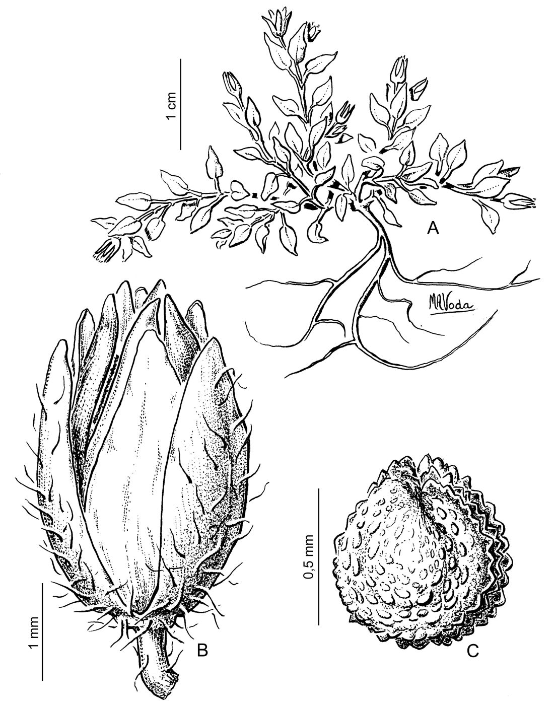 Hierba anual; tallos decumbentes, gráciles, hasta de 5-45 cm de alto, glabrescentes a unilateralmente pilosos. Hojas ovadas u ovado-redondeadas, hasta de 1,4 cm de largo, ápice obtuso, agudo a acuminado, atenuadas en la base, las inferiores pediceladas, las superiores sésiles o subsésiles. Inflorescencias en cimas dicotómicas; flores con los pedicelos hasta de 10 mm de largo, pubescentes; sépalos lanceolados, de (2,5-)3-4(-4,3) mm de largo, ápice agudo, pubescentes; pétalos ausentes o reducidos y deformados; estambres 2(-3) con las anteras grisáceas; estilos 3, ca. 0,5 mm de largo. Fruto una cápsula generalmente más larga que el cáliz, 3-valvar, con las valvas profundamente 2-fidas. Semillas reniforme-globosas, de 0,6-0,9 mm de diámetro, amarillo brillantes o castañas, con tubérculos redondeados poco elevados.