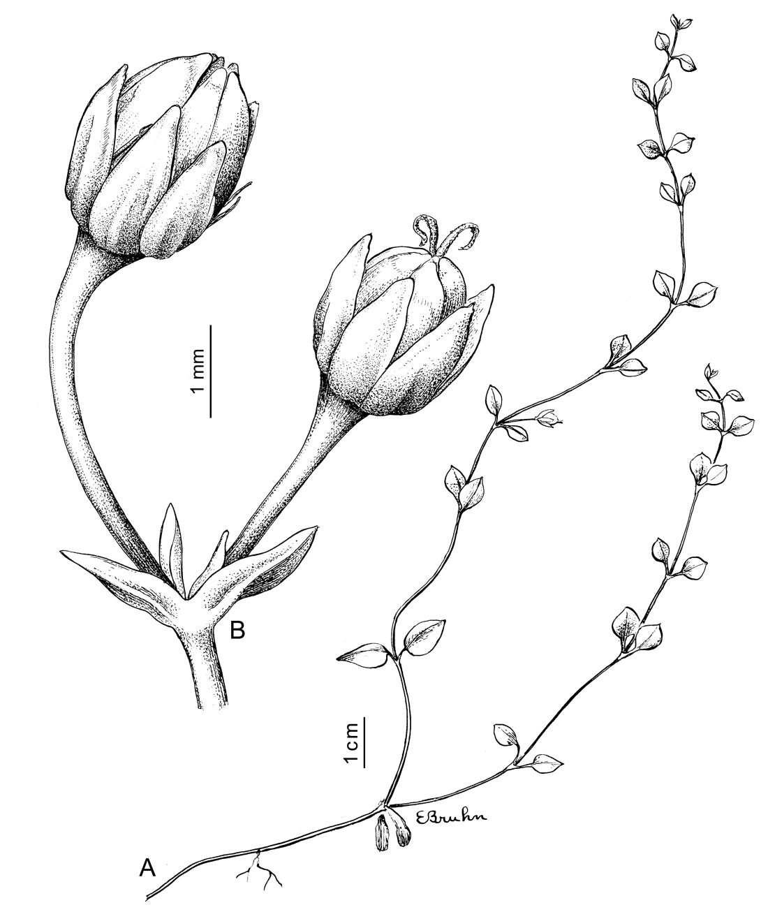 Hierba perenne, rastrera, ramificada; tallo terete a 4-angular, glabro. Hojas ovado-orbiculares, de 0,6-1,5 cm de largo, ápice brevemente cuspidado y con un breve callo, obtusas y de base o más o menos cuneadas y decurrentes, a veces ciliadas cerca de la base; pecíolo breve, a veces ciliado. Flores generalmente solitarias, raramente en cincinos 3-floros, 2-bracteadas; pedicelos de 3-11 mm de largo, glabros; sépalos ovados, de 2-3 mm de largo, de ápice agudo, herbáceos o escariosos en el margen, glabros; pétalos ausentes o 5, llegando a ½ del largo de los sépalos, 2-partidos casi hasta la base, comúnmente atrofiados o deformados; estambres 10; ovario globoso, ca. 1 mm de diámetro, con 3(-4) estilos de 1-1,2 mm de largo, óvulos 9-15. Fruto una cápsula ovoide, más larga que los sépalos, 6-valvar. Semillas ca. 1 mm de diámetro, con tubérculos alargados, estriados, los dorsales muy altos en 4 hileras paralelas.