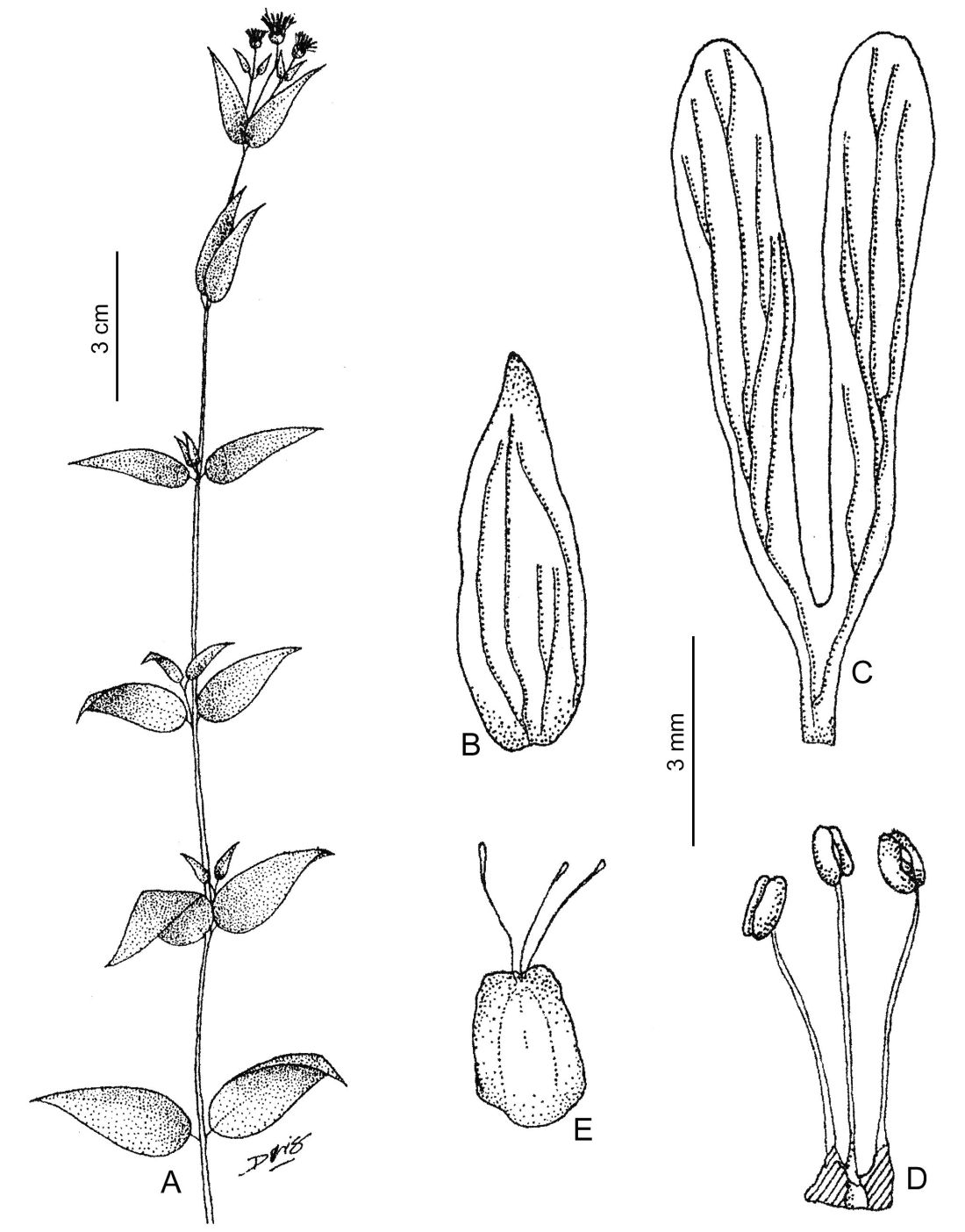 Hierba anual, laxa, apoyante, ramosa, de 50 cm de alto, ocasionalmente más alta; tallos cilíndricos, de 0,5-1,5 mm de grosor, delgados, con una angosta zona de pelos simples y glandulares dispuestos extendidamente. Hojas triangulares a ovado-triangulares u ovado-lanceoladas, de 1-4 × 0,4-3 cm, ápice acuminado, base cordada hasta atenuada, ocasionalmente pilosa hacia la base; las inferiores largamente pecioladas, las superiores sésiles; pecíolo hasta de 15 mm de largo, pubescente en una zona angosta. Flores en cimas dicotómicas laxas, con entrenudos de 10-80 mm de largo y pubescencia glandulosa; pedicelo de 12-20 mm de largo, más largos en las flores inferiores, generalmente acrescentes, algunas veces deflexos; sépalos angosto-ovados a ovado-lanceolados, de 2,5-4,5 mm de largo, acuminados, herbáceos, los márgenes internos membranoso-hialinos, glabros en el dorso, los márgenes basales ocasionalmente pilosos; pétalos de 5 mm de largo, membranáceos, 2-3-nervados, 2-partidos casi hasta la base, segmentos lineares, el ápice aguzado a redondeado; estambres 10, del mismo largo que los sépalos, con una glándula nectarífera hialina, inconspicua, en la base de los filamentos opositisépalos; ovario de 1,5 mm de largo, cortamente estipitado, pluriovulado; estilos 3, de 2-3 mm de largo. Fruto una cápsula una vez y media el largo de los sépalos, 6-valvar. Semillas casi orbiculares a reniformes, ca. 1 × 1 × 0,5 mm, la superficie con papilas manifiestas, atropurpúreas a obscuras y casi negras.