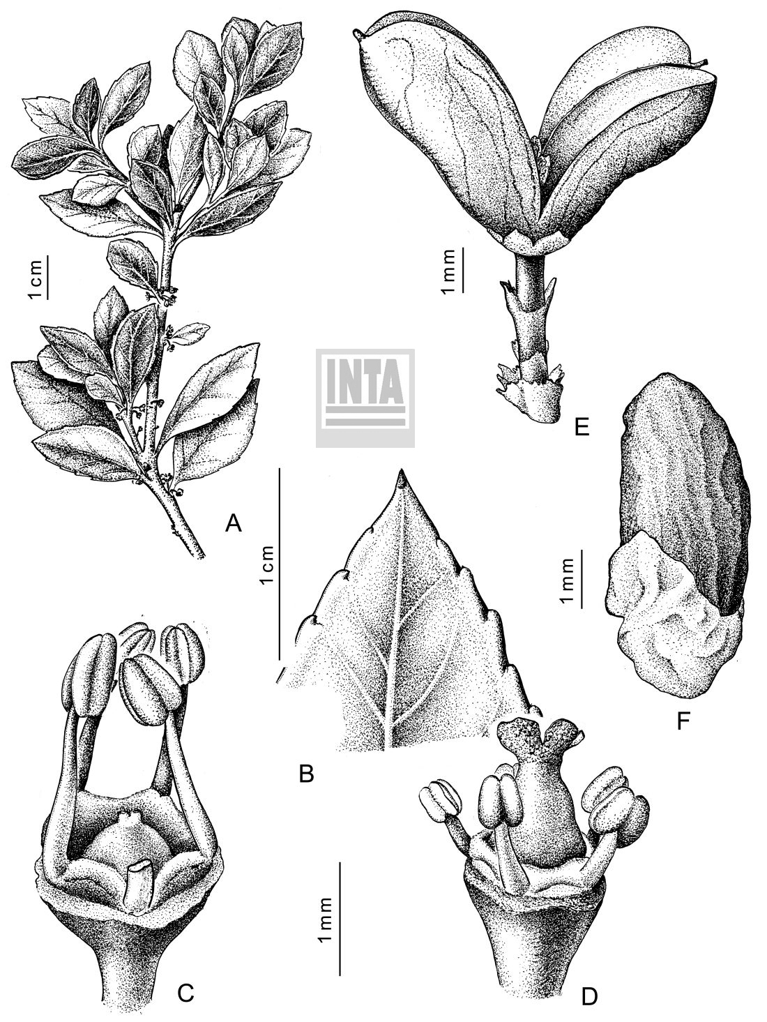 A. Rama florífera. B. Hoja, detalle del ápice. C. Flor estaminada. D. Flor pistilada. E. Fruto dehiscente. F. Semilla.