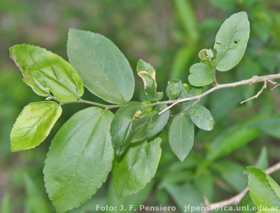Arbustos o árboles escandentes, de 2-5 m de alto; corteza lisa, grisácea; ramifi cación en zigzag, ramas glabras a subglabras, espinosas; espinas estipulares de 5-15 mm de largo, solitarias, a veces geminadas, rectas y semicurvas, grisáceas, generalmente glabras, a veces subglabras con tricomas blanquecinos. Hojas con pecíolo de 3-10 mm de largo, subglabro o piloso con tricomas color blanco; láminas suborbiculares, de 1,5-6 × (1-)1,5-3,5(-4) cm, de ápice y base redondeados, los márgenes enteros o dentados, crenado-aserrados con dientes restringidos al tercio superior; membranosas; concoloras, verde claras; cara adaxial opaca, lisa al tacto, subglabra con tricomas blanquecinos frecuentemente concentrados en las nervaduras, o más raramente distribuidos de modo uniforme tanto en las nervaduras como en la superfi cie laminar (v.g. poblaciones de Chaco y Salta; obs. pers.); cara abaxial opaca, lisa al tacto, subglabra, con nervaduras prominentes , beige contrastando con la superficie laminar; domacios conspicuos, pilosos, no ciliados, tricomas blancos distribuidos de forma uniforme en todo el domacio. Inflorescencias axilares, contraídas en fascículos cimosos. Flores estaminadas con sépalos subglabros y tricomas blanquecinos en la superfi cie externa. Flores perfectas con ovario subglabro a piloso, con tricomas blanquecinos; estilo inconspicuo, ramas estigmáticas apenas pediceladas y 2-fidas. Fruto una drupa de 5-6 × 4-5 mm, anaranjada, epicarpo subglabro, mesocarpo homogéneo, no ornamentado; pireno globoso, mediano, de 3,5-6 × 3,5-5 mm, blanco, no apiculado, ornamento alveolado-crateriforme.
