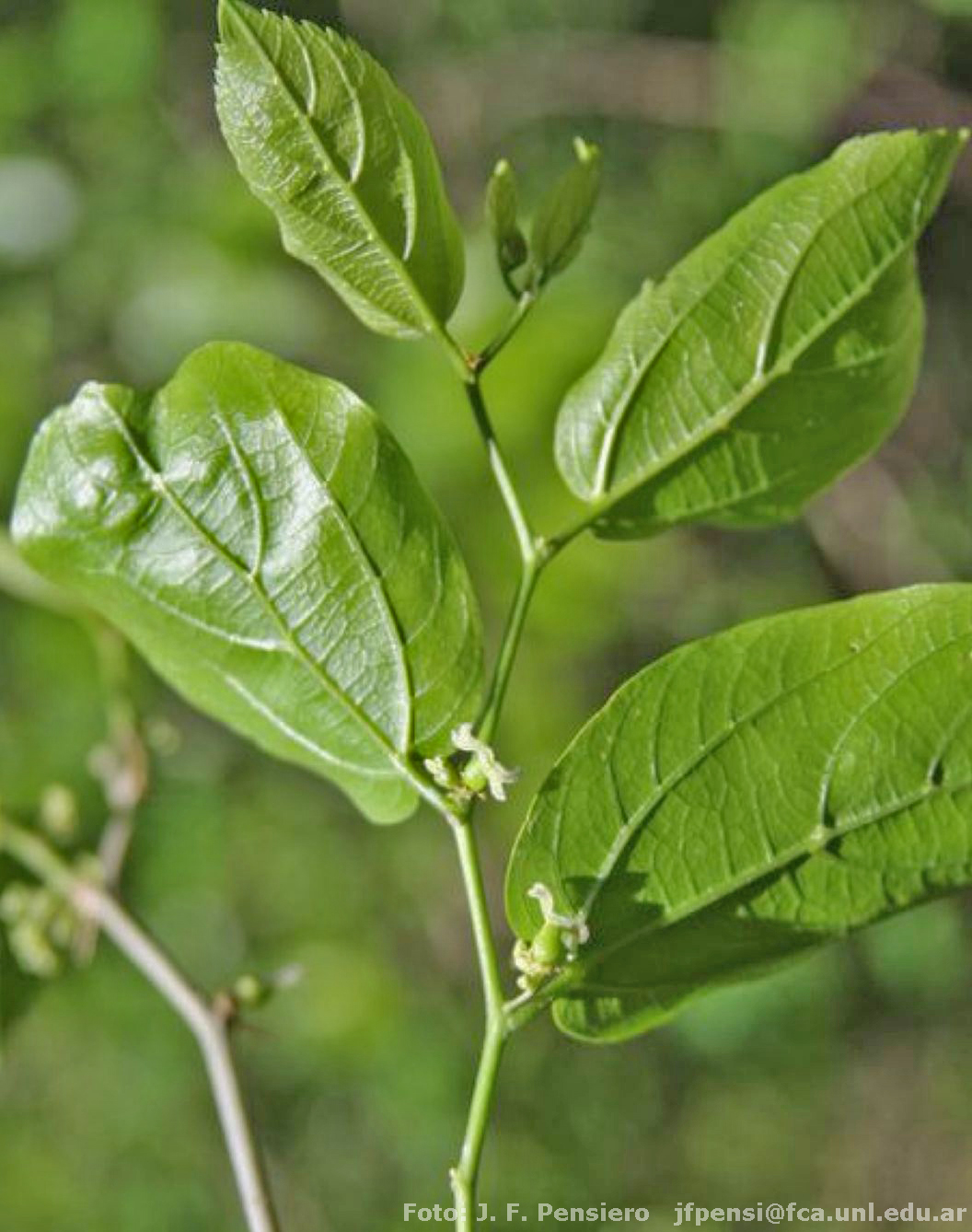 Arbustos o árboles escandentes, de 2-5 m de alto; corteza lisa, grisácea; ramifi cación en zigzag, ramas glabras a subglabras, espinosas; espinas estipulares de 5-15 mm de largo, solitarias, a veces geminadas, rectas y semicurvas, grisáceas, generalmente glabras, a veces subglabras con tricomas blanquecinos. Hojas con pecíolo de 3-10 mm de largo, subglabro o piloso con tricomas color blanco; láminas suborbiculares, de 1,5-6 × (1-)1,5-3,5(-4) cm, de ápice y base redondeados, los márgenes enteros o dentados, crenado-aserrados con dientes restringidos al tercio superior; membranosas; concoloras, verde claras; cara adaxial opaca, lisa al tacto, subglabra con tricomas blanquecinos frecuentemente concentrados en las nervaduras, o más raramente distribuidos de modo uniforme tanto en las nervaduras como en la superfi cie laminar (v.g. poblaciones de Chaco y Salta; obs. pers.); cara abaxial opaca, lisa al tacto, subglabra, con nervaduras prominentes , beige contrastando con la superficie laminar; domacios conspicuos, pilosos, no ciliados, tricomas blancos distribuidos de forma uniforme en todo el domacio. Inflorescencias axilares, contraídas en fascículos cimosos. Flores estaminadas con sépalos subglabros y tricomas blanquecinos en la superfi cie externa. Flores perfectas con ovario subglabro a piloso, con tricomas blanquecinos; estilo inconspicuo, ramas estigmáticas apenas pediceladas y 2-fidas. Fruto una drupa de 5-6 × 4-5 mm, anaranjada, epicarpo subglabro, mesocarpo homogéneo, no ornamentado; pireno globoso, mediano, de 3,5-6 × 3,5-5 mm, blanco, no apiculado, ornamento alveolado-crateriforme.