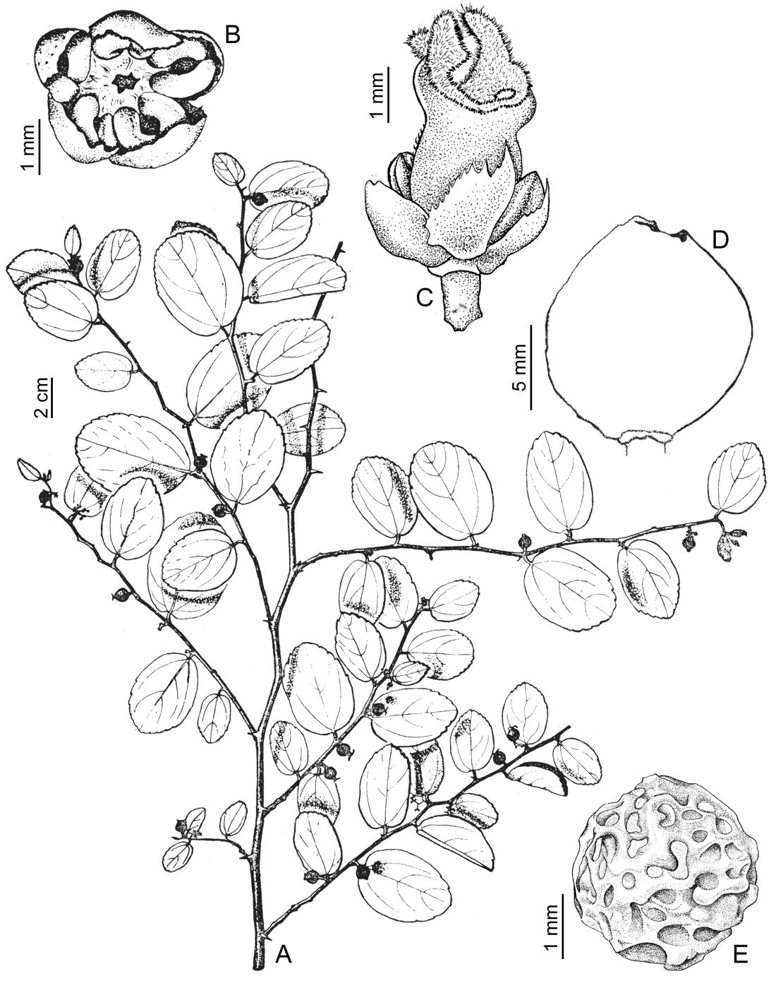 Arbustos o árboles escandentes, de 2-5 m de alto; corteza lisa, grisácea; ramifi cación en zigzag, ramas glabras a subglabras, espinosas; espinas estipulares de 5-15 mm de largo, solitarias, a veces geminadas, rectas y semicurvas, grisáceas, generalmente glabras, a veces subglabras con tricomas blanquecinos. Hojas con pecíolo de 3-10 mm de largo, subglabro o piloso con tricomas color blanco; láminas suborbiculares, de 1,5-6 × (1-)1,5-3,5(-4) cm, de ápice y base redondeados, los márgenes enteros o dentados, crenado-aserrados con dientes restringidos al tercio superior; membranosas; concoloras, verde claras; cara adaxial opaca, lisa al tacto, subglabra con tricomas blanquecinos frecuentemente concentrados en las nervaduras, o más raramente distribuidos de modo uniforme tanto en las nervaduras como en la superfi cie laminar (v.g. poblaciones de Chaco y Salta; obs. pers.); cara abaxial opaca, lisa al tacto, subglabra, con nervaduras prominentes , beige contrastando con la superficie laminar; domacios conspicuos, pilosos, no ciliados, tricomas blancos distribuidos de forma uniforme en todo el domacio. Inflorescencias axilares, contraídas en fascículos cimosos. Flores estaminadas con sépalos subglabros y tricomas blanquecinos en la superfi cie externa. Flores perfectas con ovario subglabro a piloso, con tricomas blanquecinos; estilo inconspicuo, ramas estigmáticas apenas pediceladas y 2-fidas. Fruto una drupa de 5-6 × 4-5 mm, anaranjada, epicarpo subglabro, mesocarpo homogéneo, no ornamentado; pireno globoso, mediano, de 3,5-6 × 3,5-5 mm, blanco, no apiculado, ornamento alveolado-crateriforme.