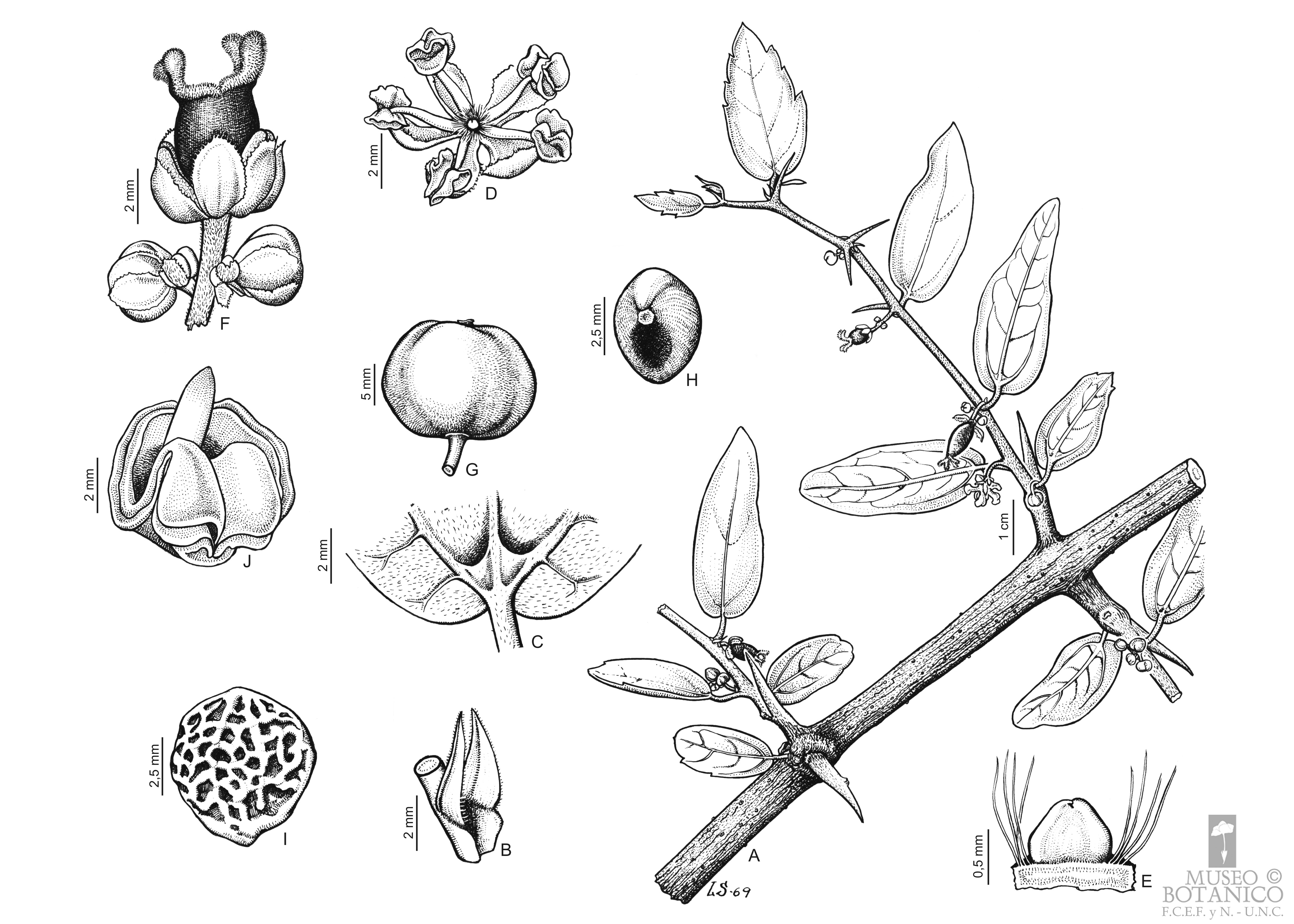 Arbustos no escandentes, de 1-5 m de alto; corteza lisa, pardo-oscura o grisácea, con lenticelas claras en las ramas jóvenes; ramificación muy sinuosa, ramas espinosas foliosas; espinas caulinares de (3-)10-20(-30) mm de largo, rectas, grises a rojo-oscuras, glabras a raramente pubescentes con tricomas blancos. Hojas con pecíolo de 1-4 mm de largo, subglabro o piloso con tricomas color blanco; láminas ovadas o estrechamente ovadas, de (1,5-)2-3(-3,5) × (0,5-)1-1,8(-2) cm, de ápice agudo o redondeado y base redondeada, los márgenes enteros o paucidentados, serrados, generalmente con menos de 4 dientes a cada lado desde el tercio medio hasta el ápice; cartáceas cuando secas; concoloras, verde claras u opacas; cara adaxial opaca, lisa o raramente escabrosa al tacto, subglabra con tricomas blancos concentrados en las nervaduras; cara abaxial lisa al tacto, subglabra, con nervaduras planas, castaño-amarillentas, similares al resto de la lámina, no contrastantes con la superficie laminar; domacios conspicuos, subglabros, ciliados. Inflorescencias axilares, contraídas en fascículos cimosos. Flores estaminadas subglabras o pilosas con tricomas blancos. Flores perfectas con ovario glabro, a veces subglabro; estilo nulo, truncado en el ápice, ramas estigmáticas sésiles y 2-lobuladas. Fruto una drupa de 4,5-5,5 × 3-3,5 mm, naranja; epicarpo glabro ; mesocarpo homogéneo, no ornamentado; pireno ovoide, pequeño, de 2,5-3 × 1,5-2,5 mm, rosa-crema, con un apículo de 0,25-0,5 mm de largo, ornamento alveolado. Var. pallida.- Láminas foliares concoloras, cara abaxial glabra a subglabra; tricomas concentrados en las nervaduras; domacios conspicuos, glabros a ciliados.