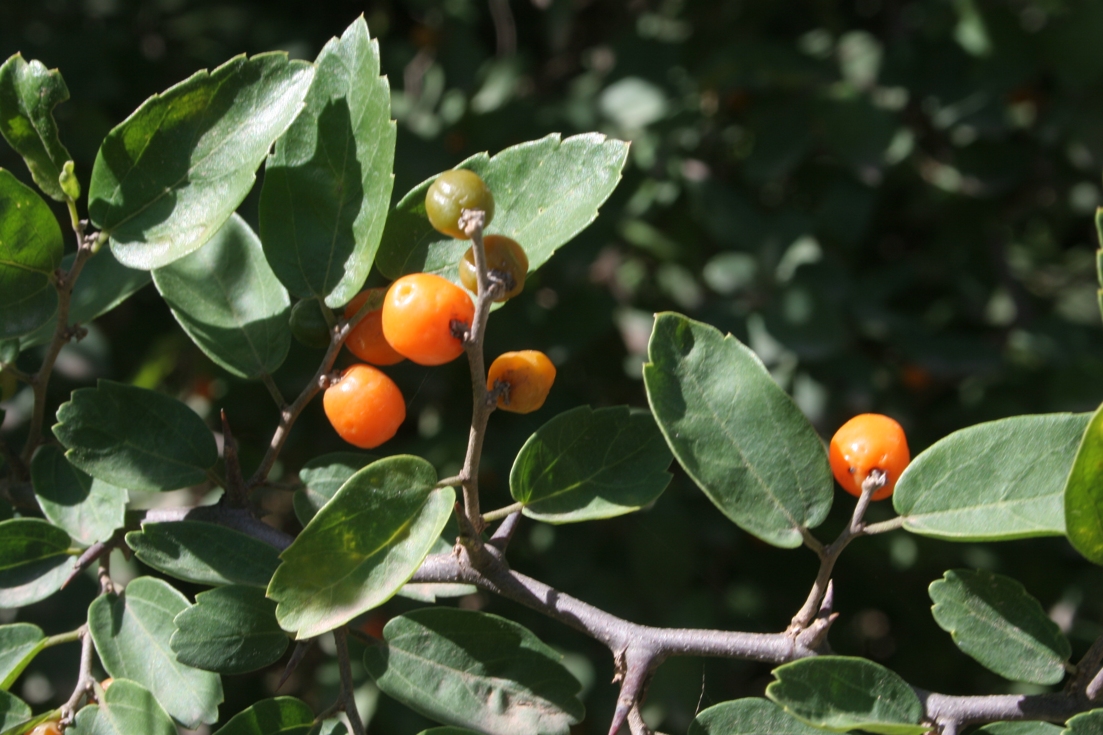 Arbustos no escandentes, de 1-5 m de alto; corteza lisa, pardo-oscura o grisácea, con lenticelas claras en las ramas jóvenes; ramificación muy sinuosa, ramas espinosas foliosas; espinas caulinares de (3-)10-20(-30) mm de largo, rectas, grises a rojo-oscuras, glabras a raramente pubescentes con tricomas blancos. Hojas con pecíolo de 1-4 mm de largo, subglabro o piloso con tricomas color blanco; láminas ovadas o estrechamente ovadas, de (1,5-)2-3(-3,5) × (0,5-)1-1,8(-2) cm, de ápice agudo o redondeado y base redondeada, los márgenes enteros o paucidentados, serrados, generalmente con menos de 4 dientes a cada lado desde el tercio medio hasta el ápice; cartáceas cuando secas; concoloras, verde claras u opacas; cara adaxial opaca, lisa o raramente escabrosa al tacto, subglabra con tricomas blancos concentrados en las nervaduras; cara abaxial lisa al tacto, subglabra, con nervaduras planas, castaño-amarillentas, similares al resto de la lámina, no contrastantes con la superficie laminar; domacios conspicuos, subglabros, ciliados. Inflorescencias axilares, contraídas en fascículos cimosos. Flores estaminadas subglabras o pilosas con tricomas blancos. Flores perfectas con ovario glabro, a veces subglabro; estilo nulo, truncado en el ápice, ramas estigmáticas sésiles y 2-lobuladas. Fruto una drupa de 4,5-5,5 × 3-3,5 mm, naranja; epicarpo glabro ; mesocarpo homogéneo, no ornamentado; pireno ovoide, pequeño, de 2,5-3 × 1,5-2,5 mm, rosa-crema, con un apículo de 0,25-0,5 mm de largo, ornamento alveolado. Var. discolor.- Láminas foliares discoloras, cara abaxial pubescente a velutina, serícea; tricomas distribuidos por toda la superficie de la lámina, incluyendo las nervaduras; domacios inconspicuos, pubescentes.