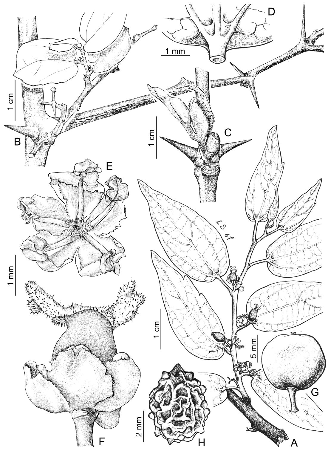 A. Rama fructífera. B. Porción de rama con espinas. C. Espinas geminadas. D. Hoja, detalle de la cara abaxial y domacios. E. Flor estaminada. F. Flor perfecta. G. Fruto (detalle del exocarpo). H. Pireno (endocarpo).