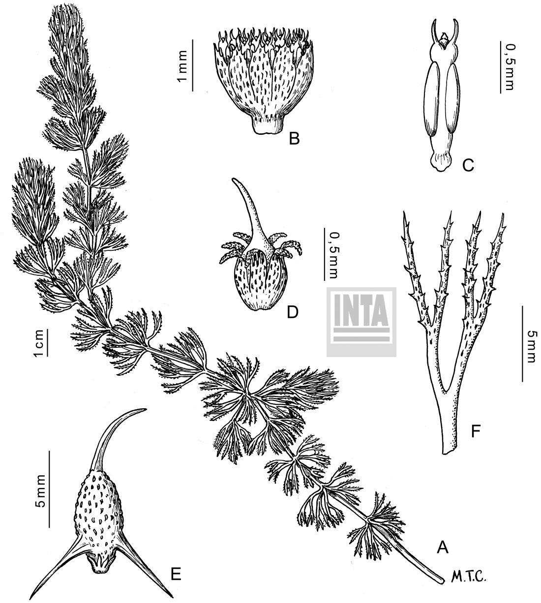 Plantas de 10-100 cm de largo. Tallos rígidos, con entrenudos de 1-4 cm de largo. Hojas rígidas, de 0,8-3,5 cm de largo, con láminas divididas 1 ó raramente 2 veces. Flores estaminadas con 12 brácteas de 1 mm de largo; estambres 12-20. Flores pistiladas con 11 brácteas de 1,2-2 mm de largo. Frutos de 4-7 mm de largo, de superficie tuberculada, con estilo persistente, unciforme, de 6-15 mm de largo y 2 espinas basales recurvadas de igual longitud o algo menores.
