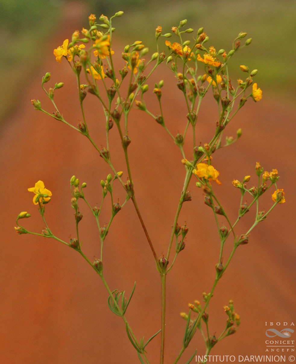 Subarbustos de 15-50 cm de alto; tallos erectos, rojizos, con corteza exfoliante. Hojas sésiles, con láminas elípticas u oblongo-lineares, de 1-2 × 0,3-0,5 cm, base no decurrente, ápice obtuso a redondeado, cartáceas, glándulas densas presentes. Inflorescencias corimbosas, multifloras (más de 25 flores); pedicelos de 1-2 mm de largo; brácteas lineares. Flores de 0,8-1 cm de diámetro; sépalos lanceolados, imbricados, de 2,5-4 × 0,5-1 mm, glándulas punctiformes o lineares; pétalos oblongos a lineares, de 4-6 × 2-3 mm, amarillos, glándulas escasas; estambres 40, fasciculados, de 2-3 mm de largo; ovario ovoide, de 1-2 mm de largo; estilos 5, raramente 4 o 3; de 1-2 mm de largo; estigmas capitados. Cápsulas ovoides a globosas, ca. 4 × 3 mm, de igual largo o más cortas que los sépalos. Semillas ca. 0,5 mm de largo.