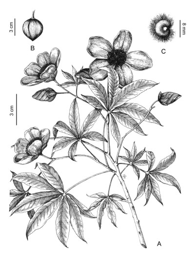 Árboles de 4-10 m de alto; tronco de 20-80 cm de diámetro, glabro, con ritidoma exfoliante, separado del tronco en capas castañas, papiráceas. Hojas con pecíolo de 5-9 cm de largo; láminas 5-9 folioladas, de 5-10 × 7-14 cm, ápice acuminado, base angostada, membranáceas; estípulas de 4-6 mm de largo. Inflorescencia un racimo terminal, con 3-5 ramas; brácteas florales de 1,8-2,2 cm de largo. Flores de 7-9 cm de diámetro; sépalos 5, glabros a pubescentes, ciliados, los exteriores de 7-8,5 × 5-6,8 mm, los interiores de 10-12 × 7-8 mm; pétalos 5, imbricados o contortos, de 3-4 × 2-2,4 cm, amarillo-anaranjados, ápice emarginado, ciliados; estambres con filamentos de 5-8 mm de largo, anteras de 2,4-3,4 × 0,6-0,8 mm, dehiscentes por 1-2 poros apicales; ovario súpero, ca. 4 mm de diámetro, glabro. Fruto una cápsula globosa, de 2,4-3,3 cm de diámetro, acuminada, péndula. Semillas de 7-8 mm de diámetro, cubiertas sobre una cara por una hilera de tricomas densos, ca. 4 mm de largo.