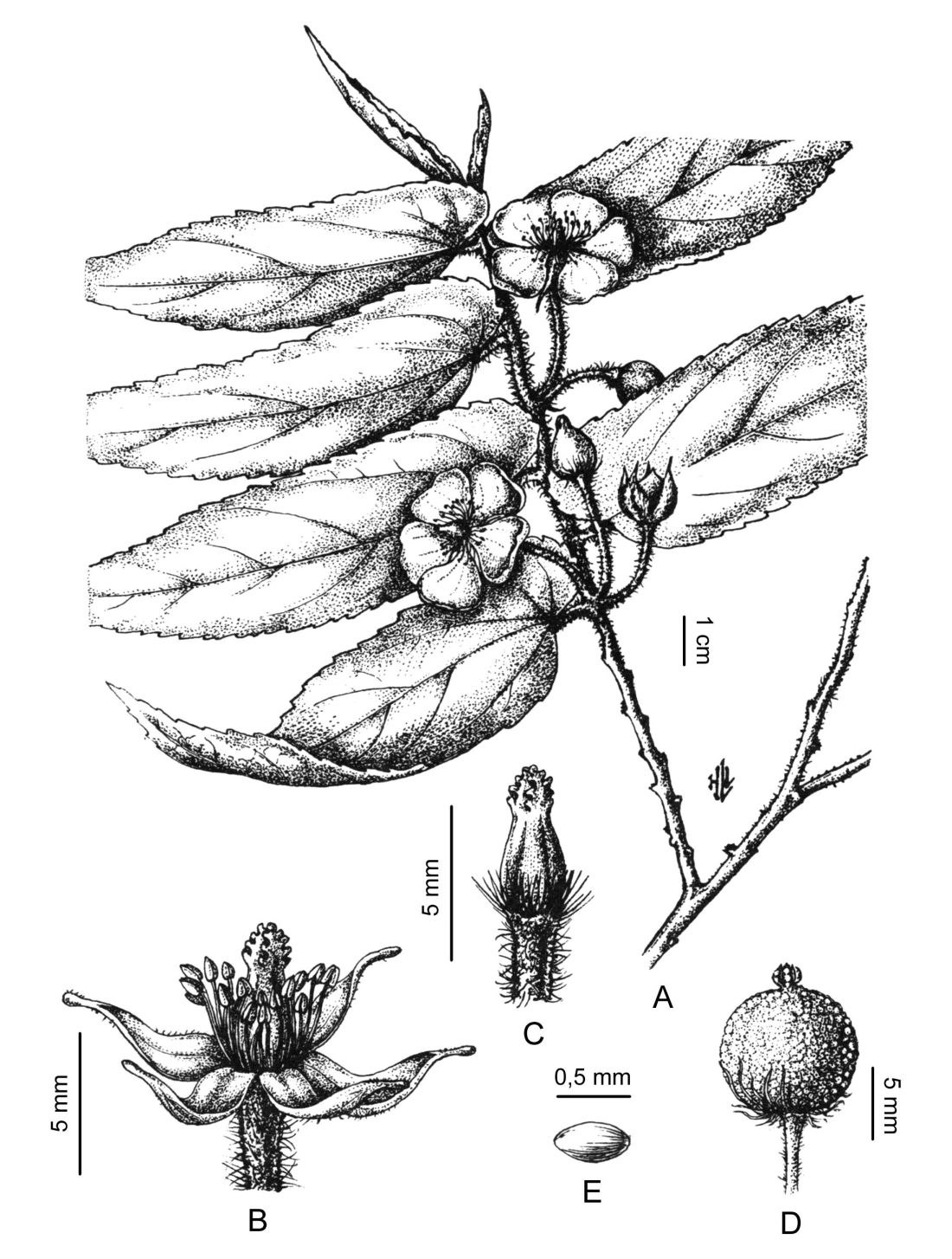 A. Rama florífera. B. Flor. C. Ovario. D. Fruto. E. Semilla. Tomado de Opera Lilloana 34: fig. 80. 1982.