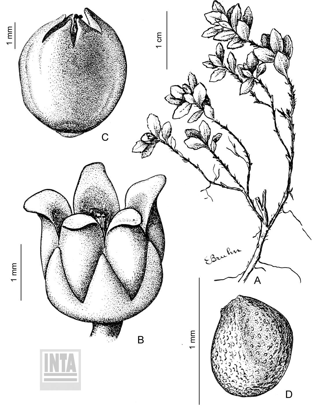 Subarbustos enanos, dioicos, hasta de 10 cm de alto; ramas delgadas y procumbentes. Hojas laxas, con pecíolo de 0,5 mm de largo; láminas glabras, coriáceas y lustrosas, ovado-oblongas, de (3) 4-7 × 1,5-3 (5) mm, algo agudas, margen engrosado, con 4-6(-8) dientes pequeños y redondeados a cada lado; venación apenas visible. Flores solitarias, axilares, pedicelo de alrededor de 0,5 mm de largo en las flores pistiladas y de 1-1,5 mm en las estaminadas, rodeadas en la base por 6 pequeñas brácteas, las dos superiores opuestas e insertas inmediatamente debajo del cáliz, éste 5-lobulado, lóbulos ca. 1,3 mm de largo, triangulares y obtusos. Flores estaminadas con corola de 3 mm de largo, campanulado-esférica; estambres 10, todos del mismo tamaño, con anteras papilosas, de 0,5 mm de largo. Flores pistiladas con corola de 2 mm de largo. Fruto una cápsula de 4,5 mm de diámetro, globosa a turbinada, rodeada por los sépalos de color rojo, engrosados y carnosos, que dejan visible el ápice de la cápsula.