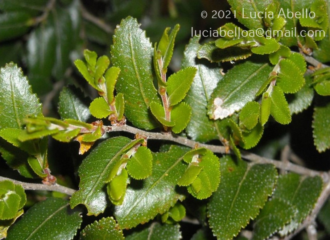 Árboles perennifolios que alcanzan hasta 45(-50) m de alto, con tronco cilíndrico y recto, hasta de 2,5-3 m de diámetro; corteza grisácea más o menos rugosa, verticalmente agrietada. Hojas coriáceas de vernación plana; pecíolos gruesos, breves, de 1-3 mm de largo; estípulas oblongas, de 3-4 mm de largo × 1-1,5 mm de ancho, de base redondeada y ápice agudo, peltadas, con la región basal poco manifiesta y margen hialino; láminas ovadas, ovadolanceoladas u ovado-rómbicas, de (1-)2-3,5(-4) × (0,5-)1-1,5(-2) cm, de base aguda, a veces oblicua, más o menos asimétrica, ápice agudo y margen agudamente serrado; venas secundarias en número de 5 pares; epidermis adaxial y abaxial con tricomas glandulares pluricelulares grandes y tricomas 1-celulares cónicos (no hay tricomas 1-celulares solitarios); engrosamientos de cutícula en forma de «T» en los polos del complejo estomático separando las células guardianas. Inflorescencias estaminadas: dicasios (1-2-)3 floros, en número de 1-2 en las axilas de los primeros nomófilos de los brotes prolépticos, las inferiores en las axilas de las brácteas perulares durante sus primeros estadios de desarrollo; pedúnculos de 3-4 × 0,8-1 mm, provistos de tricomas 1-celulares. Flores estaminadas sésiles a brevemente pediceladas; perianto campanlado, de 1,8-3,8 × 2-3 mm, 4-5-lobulado, membranáceo, generalmente con tricomas 1-celulares en los márgenes y sobre los nervios; estambres 8-15, exertos, filamentos ca. 2,5-4 × 0,1 mm, dotados en la región de inserción de la antera de escasos pelos 1- celulares; anteras linear-oblongas, de 2,5-3,5 × 0,5-1 mm, 2-loculares, apiculadas, con escasísimos tricomas 1-celulares en la base. Inflorescencias pistiladas: dicasios 3-floros sésiles, rodeados por una cúpula 4-valvada. Cúpulas florales en número de 1-5 en las axilas de los nomófilos siguientes a los portadores de las inflorescencias estaminadas, protegidas por las estípulas correspondientes durante los primeros estadios de desarrollo, ca. 2 mm de largo × 1-1,5 mm de diámetro; brácteas 2, dispuestas lateralmente en la base de la cúpula cubriendo el par de valvas correspondiente, cóncavas, de contorno ovado a oblongo e irregularmente lobuladas en el ápice, membranáceas, base dorsalmente pilosa y provista de numerosas glándulas sobre la superficie adaxial, lóbulos terminados en glándulas; valvas ovoides, carnosas, con 3-4 series de lamelas solitarias, imbricadas, dispuestas a distinta altura sobre la superficie dorsal de las mismas; lamelas estrechamente ovadas a oblongas, con glándulas en el ápice y en la base de la cara adaxial, reduciéndose progresivamente de tamaño hacia el extremo distal de las valvas. Flores pistiladas sésiles, la central 2-mera, 2-alada, las laterales 3-meras, 3-aladas; perianto reducido a 2-3 piezas, según la posición de la flor, a modo de expansiones ascendentes de las alas del ovario; gineceo 2-3- carpelar, 2-3-locular; estilos hasta de 0,5 mm de largo; estigmas gruesos