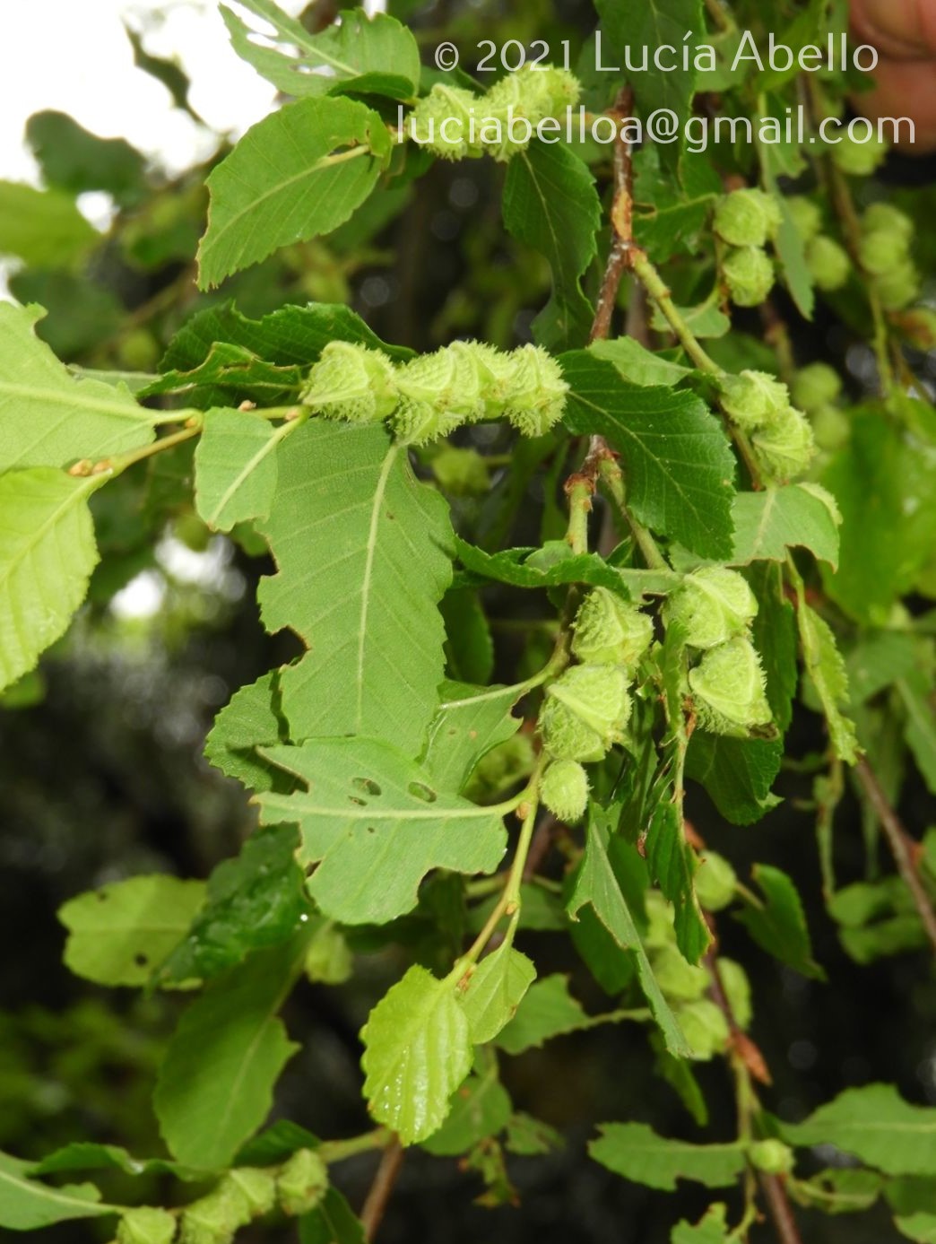 Árboles deciduos hasta de 40 m de alto o más y tronco de 40 cm o más de diámetro (hasta 120-200 cm), muy ramoso; corteza pardo-oscura agrietada. Hojas cartáceas de vernación plicada, verde-oscuras; pecíolos de 4-10 mm de largo, gruesos, más o menos pilosos; estípulas triangulares, de 4-5,5 × 1-1,5 mm, ocasionalmente auriculadas, de inserción basal o peltadas con región basal breve, angostándose hacia el ápice, pilosas en los bordes y aurículas; láminas elíptico-oblongas a ovado-lanceoladas, de (1,5-)2-6,5(-8,5) × (0,8-)1,5-3,5(-4) cm, de base oblicua, ligeramente asimétrica, margen ondulado y biserrado, venas secundarias 8-9 pares, superficie glabra o con pelos, especialmente hacia la base sobre los bordes y nervios; epidermis adaxial y abaxial con tricomas glandulares pluricelulares grandes y tricomas 1-celulares solitarios, grandes, de pared delgada y, en ocasiones, con papilas alrededor de las células guardianas de los estomas; tricomas 1-celulares cónicos en la superficie abaxial. Inflorescencias estaminadas: pseudantios (dicasios «unifloros») en número de 1-5, sésil, axilares a las catáfilas distales y a los primeros nomófilos de los brotes prolépticos; pedúnculos recurvos en la base, de 3-6,5 × 0,5-0,7 mm, provisto de tricomas 1-celulares. Perianto estaminado, anchamente campanulado a rotáceo, 8-12-lobado, lóbulos irregulares, provisto de tricomas 1-celulares en el margen y sobre los nervios; estambres 7-45, filamentos de 0,6-2,1 × 0,1-0,2 mm, anteras oblongas, de 1,1-2,5 × 0,5-0,9 mm, glabras. Inflorescencias pistiladas: dicasios 3-floros, sésiles, rodeados por una cúpula 4- valvada. Cúpulas florales en número de 1-5 en las axilas de los nomófilos siguientes a aquellos portadores de inflorescencias estaminadas, brevemente pedunculadas, al igual que en las especies anteriores protegidas y parcialmente ocultas por el par estipular asociado; brácteas 6, dispuestas en la base de la cúpula, 2 laterales, lanceoladas, las restantes cortas y anchas, irregularmente hendidas, todas ellas con tricomas 1-celulares en los márgenes; valvas carnosas, hemisféricas, con 4-7 series horizontales múltiples de lamelas sobre la superficie externa; lamelas polimorfas, ovadas a lanceoladas, irregularmente lobuladas, lóbulos con glándulas apicales y pelos. Flor central 2-mera, 2-alada; flores laterales 3- meras, 3-aladas, zigomorfas por la reducción de la pieza de perianto externa; perianto de 2-4 piezas en la flor central y de 3-6 piezas en las flores laterales, piezas a modo de expansiones ascendentes de las alas del ovario y de brevísimas proyecciones, desarrolladas o no, alternas a estas; gineceo, 2-3-carpelar, 2-3-locular, dependiendo de la posición de la flor; estilos cortos; estigmas globosos. Cúpulas fructíferas lignificadas, de 7-15 mm de largo (incluido el pedúnculo de 3-4 mm) × 7-10 mm de diámetro; lamelas de 1-2 × 0,5-1 mm. Aquenio central de 6-10 × 6-10 mm, 2-alado; aquenios laterales de 5 × 5 mm, 3-alados;