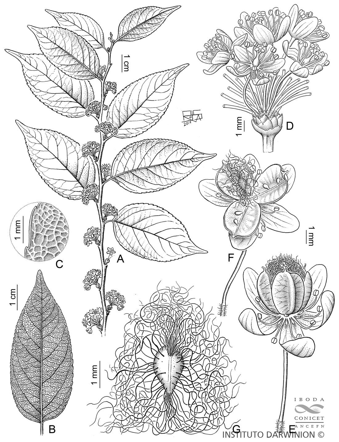 A. Rama florífera. B. Hoja. C. Hoja, detalle del margen. D. Inflorescencia (algunas flores han sido retiradas). E. Fruto al comienzo de la dehiscencia. F. Fruto dehiscente. G. Semilla.