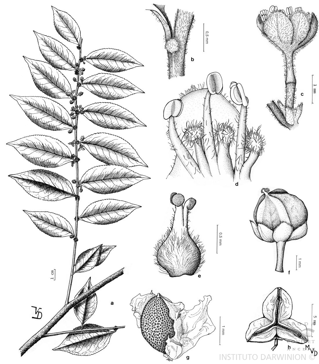 A. Rama con flores y frutos. B. Estípula. C. Flor estaminada. D. Estambres y lóbulos del disco. E. Gineceo. F. Fruto rodeado por el cáliz persistente. G. Semilla con arilo. H. Fruto dehiscente, vista apical.
