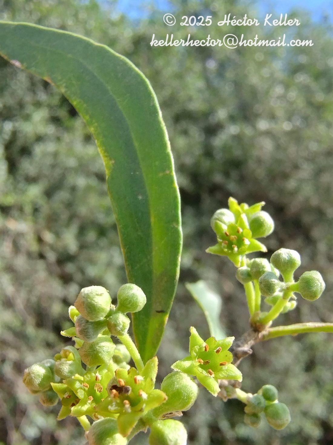 Árbol ca. 8 m de alto; tronco de 20-25 cm de diámetro; ramas inermes o con algunas espinas axilares rectas de 8-9 mm de largo. Hojas alternas, brevemente pecioladas; láminas lanceoladas, falcadas, de 5-13 × 0,6-1 cm, atenuadas en la base, de ápice obtuso hasta acuminado, nervadura central sobresaliente en toda su longitud. Inflorescencias en cimas paucifloras, de 10- 18 mm de largo, axilares, pubescentes; pedúnculo de 5-10 mm de largo; brácteas en la base de las flores, a veces reducidas, pubescentes. Flores perfectas, verdosas, perfumadas; perigonio campanulado, tubo breve con 5 lóbulos ovados, exteriormente pubescente; estambres con filamentos breves y anteras introrsas con pequeño mechón de tricomas detrás de cada una; disco nectarífero formado por 5 lóbulos carnosos interestaminales, un tercio más cortos que los lóbulos tepalinos; estilo delgado de 1-2 mm de largo, estigma algo achatado y brevemente lobulado. Fruto globoso, ca. 18 mm de diámetro, amarillenta.