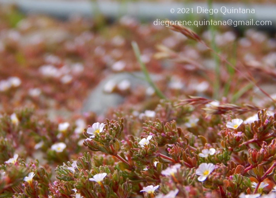 Hierba anual, de 8-40 cm de alto, postrada, muy ramificada desde la base, tallos esparcidamente pubescentes. Hojas de 2,5-5 × 1,5-3,5 mm de largo, obovadas, oblongas a elípticas, a veces las basales orbiculares, suculentas, de ápice obtuso a retuso, raro ligeramente emarginado, planas a levemente revolutas, ligeramente pubérulas en la cara abaxial y glabras en la cara adaxial; vaina interfoliar ciliada, pecíolos de 0,9-2 mm de largo. Inflorescencias en dicasios axilares y terminales de (1-)2-4 flores perfectas, sésiles; brácteas florales de 1-2 × 0,5-1,2 mm, en verticilos de a 4 y connadas en la base; cáliz de 3-5 × 1-2 mm, cilíndrico, 5-costado, con los dientes linear-lanceolados, acuminados y con el margen cortamente ciliado; corola de 5 pétalos de 2,9-6 × 1-2,5 mm, oblongos a oblanceolados a espatulados, blancos a rosados, ligeramente denticulados en el ápice; lígula de 1,5-2,5 mm de largo, oblanceolada a elíptica; estambres 6, de 4 mm de largo, con los filamentos delgados y las anteras versátiles; ovario de 1-1,8 × 0,5-1 mm, 3-gono, 3-carpelar, con 30-60 óvulos, 3 placentas parietales, estilo 3-fido, estigmas capitados. Fruto una cápsula ovoide a oblongo-ovoide, de 2-3 × 1-2 mm, escariosa, rojiza. Semillas numerosas, de contorno oblongo a elipsoideas, de 0,5-0,7 × ca. 0,3 mm, papilosas, castaño-doradas.