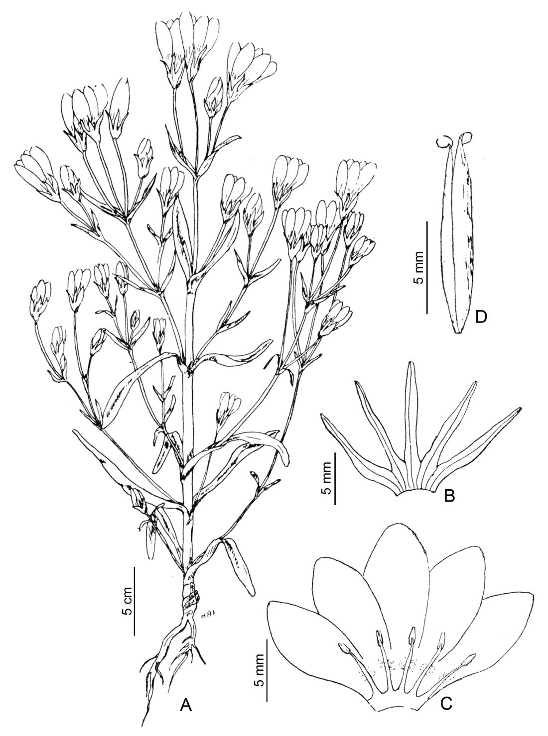 A. Hábito. B. Cáliz desplegado. C. Corola desplegada mostrando androceo. D. Cápsula joven. Tomado de Notas Mus. La Plata, Bot. 15(76): 125, fig. 4. 1950.